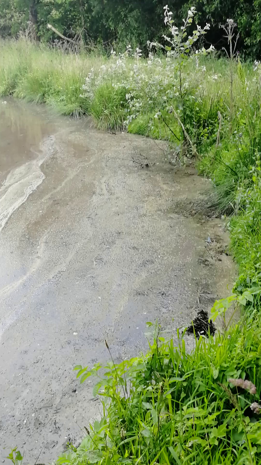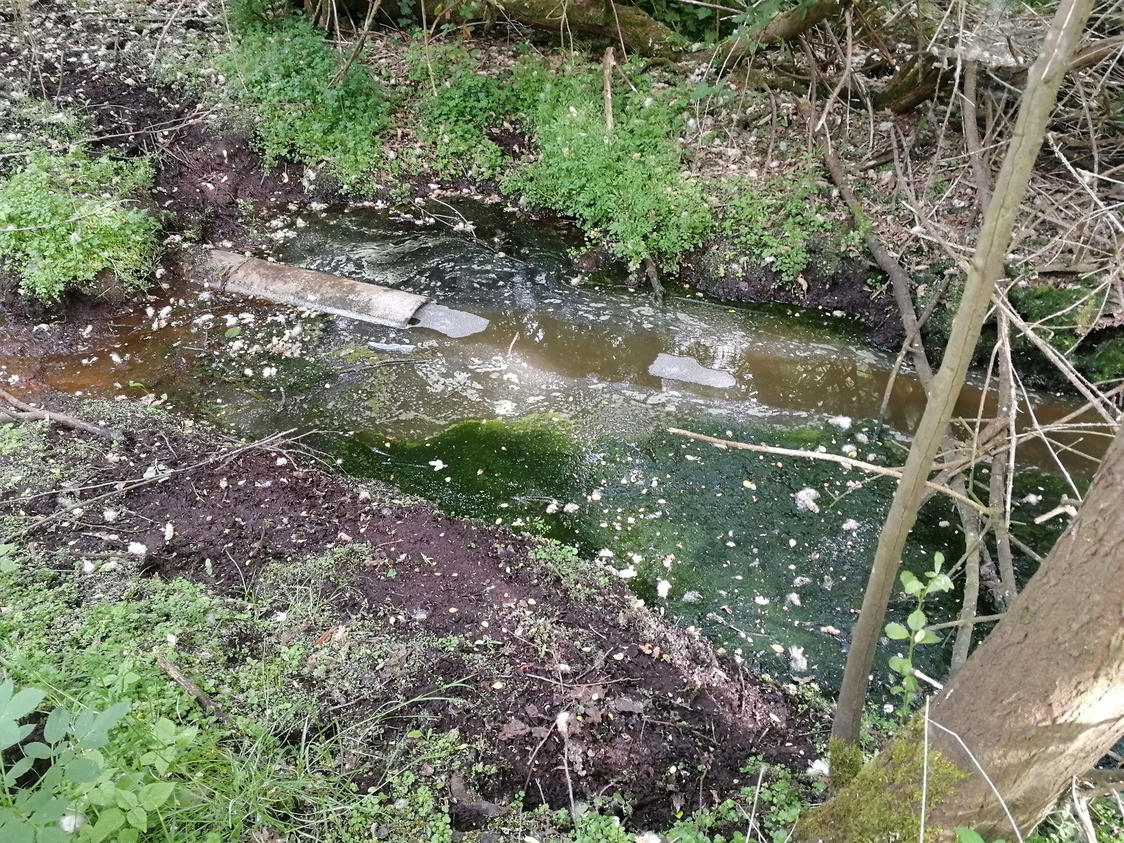 Pollution du cours d'eau de la Guerge (un affluent du Couesnon) par un rejet situé en aval d'une champignonnière sans qu'il ne semble avoir eu le moindre traitement.
