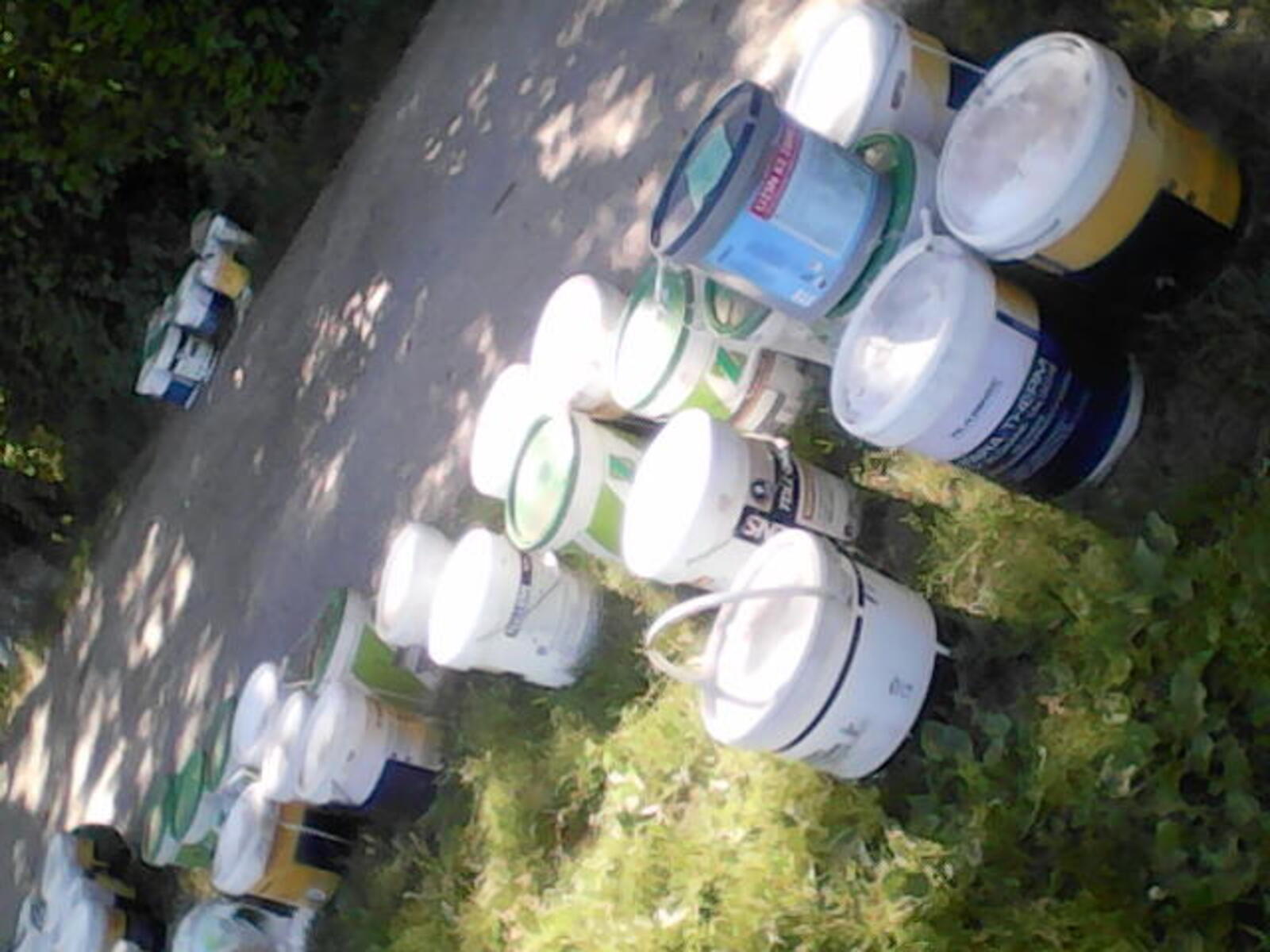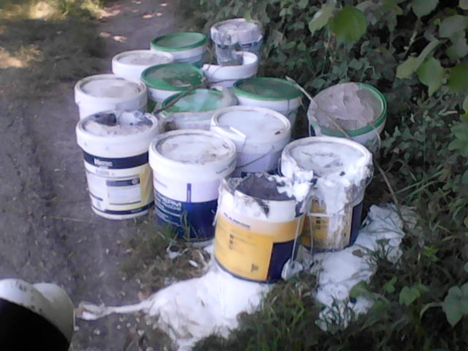 Nombreux pots d'enduits et autres produits de travaux abandonnés à proximité d'un cours d'eau.