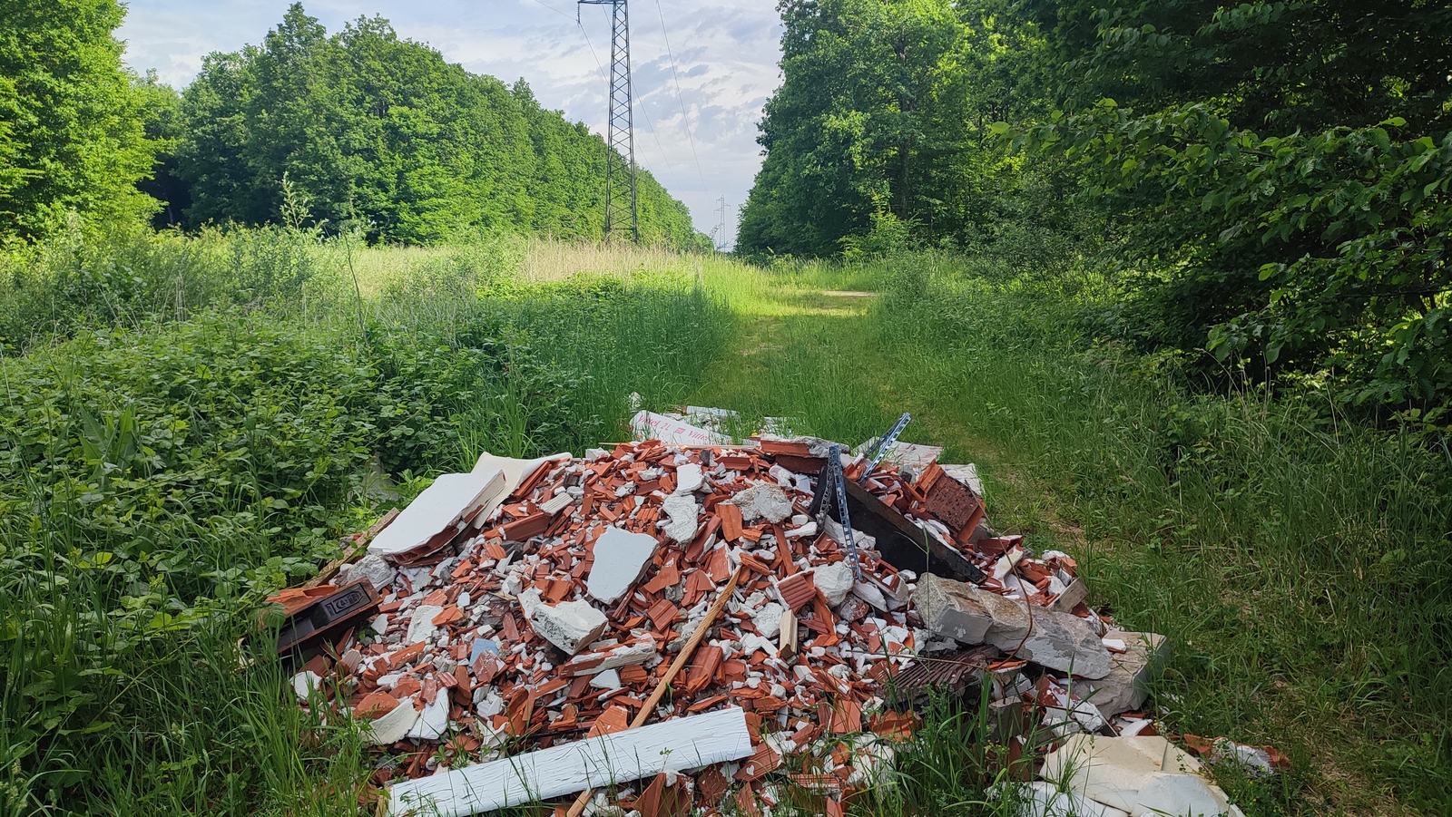 Il s'agit d'un dépôt de gravats provenant de la démolition d'une cheminée. Béton, plâtre, brique, fonte et toile de verre peuvent être observés. Le dépôt est situé au sein d'une forêt domaniale.