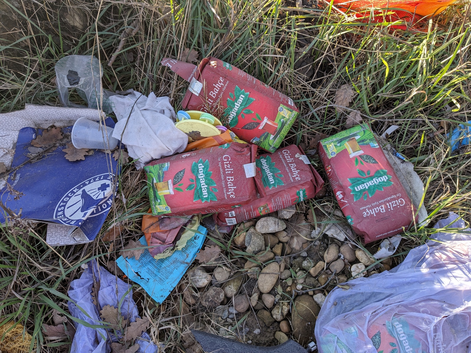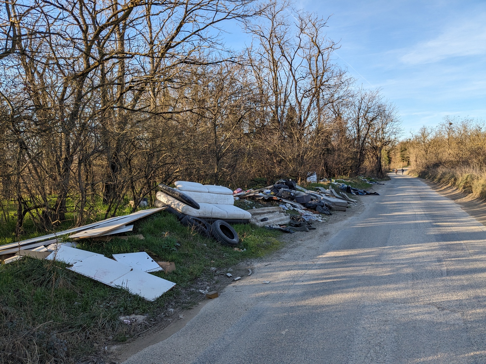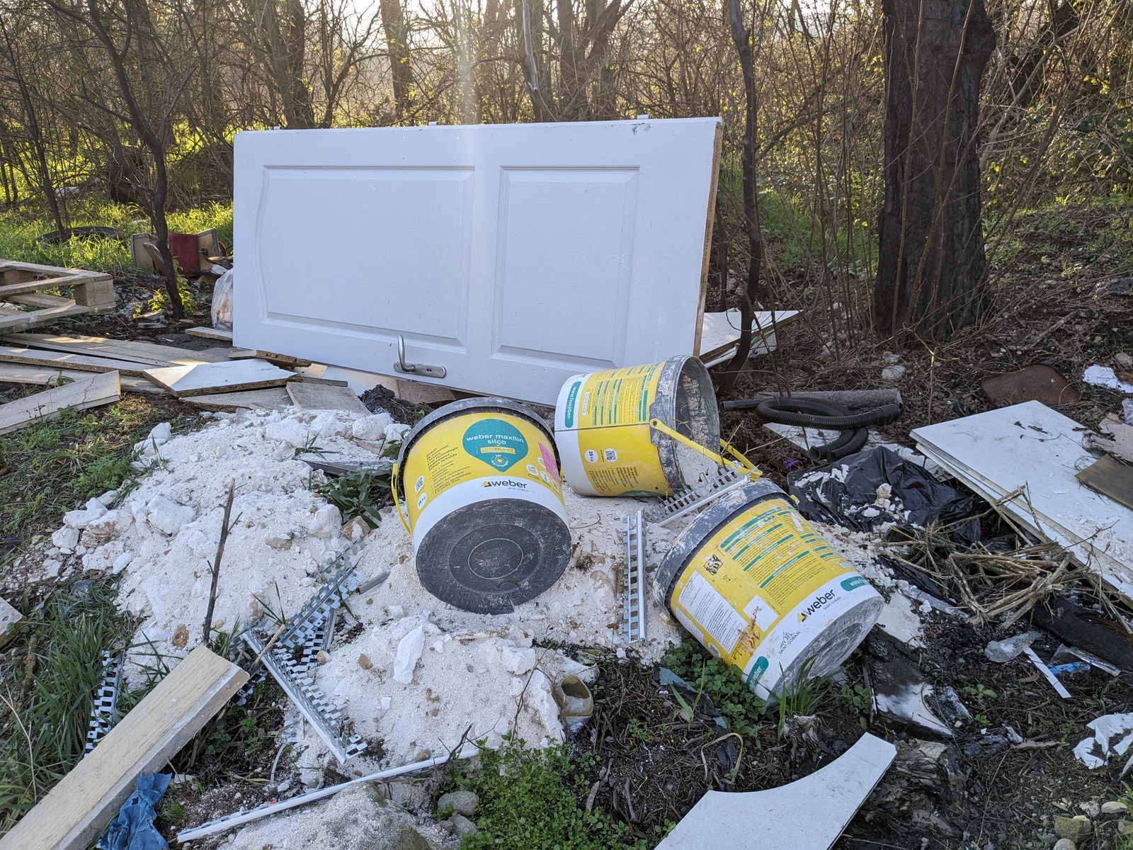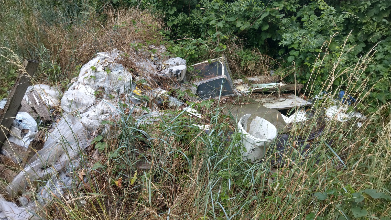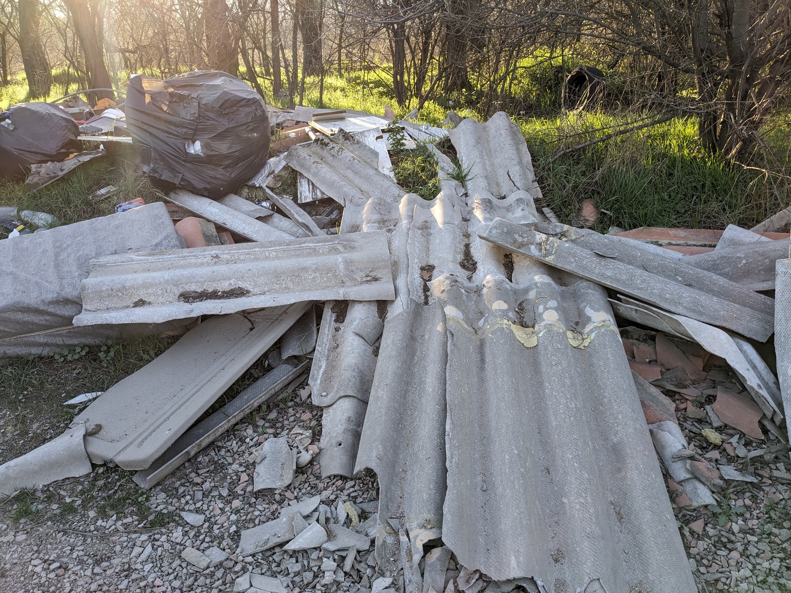 Nombreux déchets, réfrigérateurs, métal, bâche plastique, tissus, sacs, bidons plastiques, gravats
