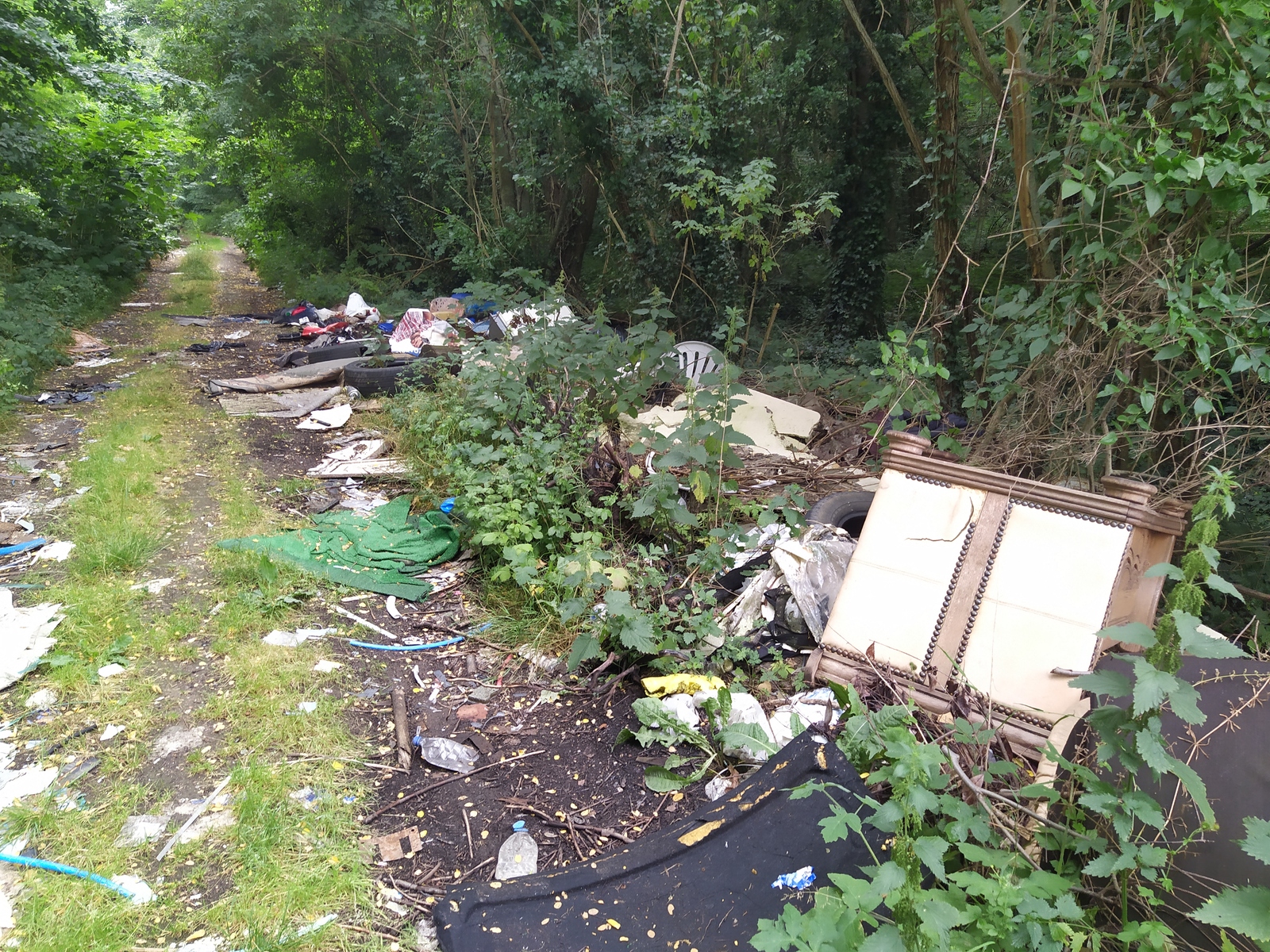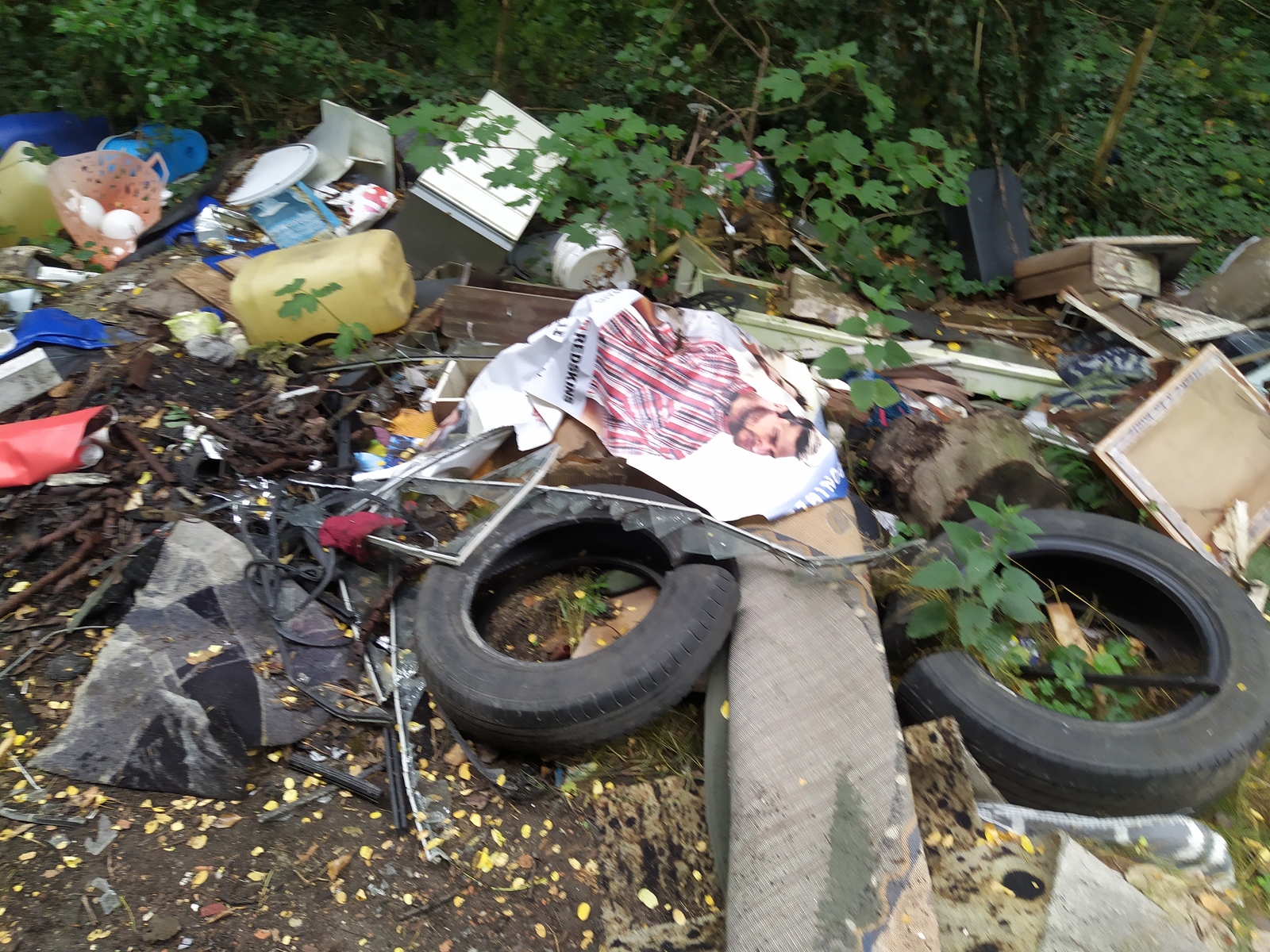 Dépôt illégal de déchets dans une zone boisée. On y trouve des pneus, des pots de peinture, des meubles etc