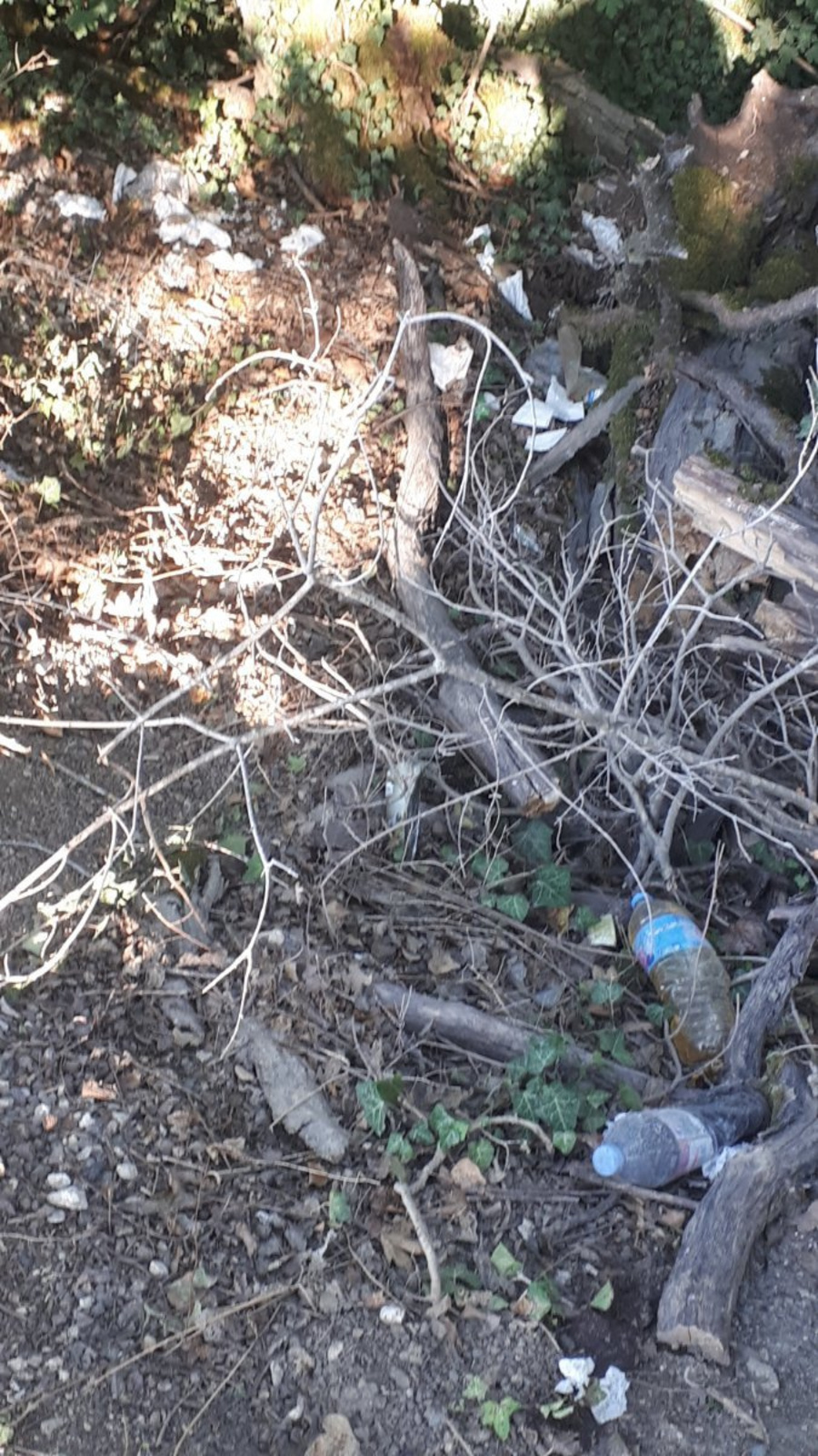 Il s'agit d'un dépôt de déchets présent dans un espace avec de la végétation, situé à proximité d'un parking. Les déchets sont divers : plastique, papier etc.