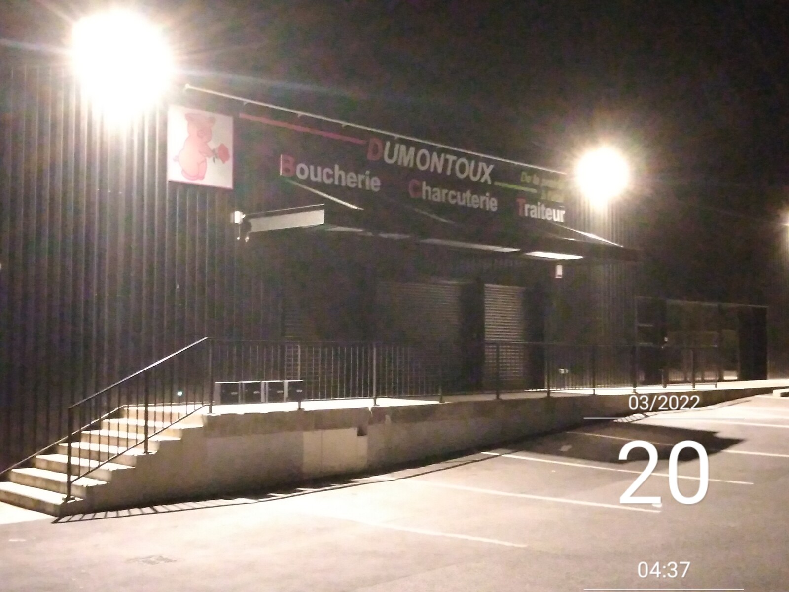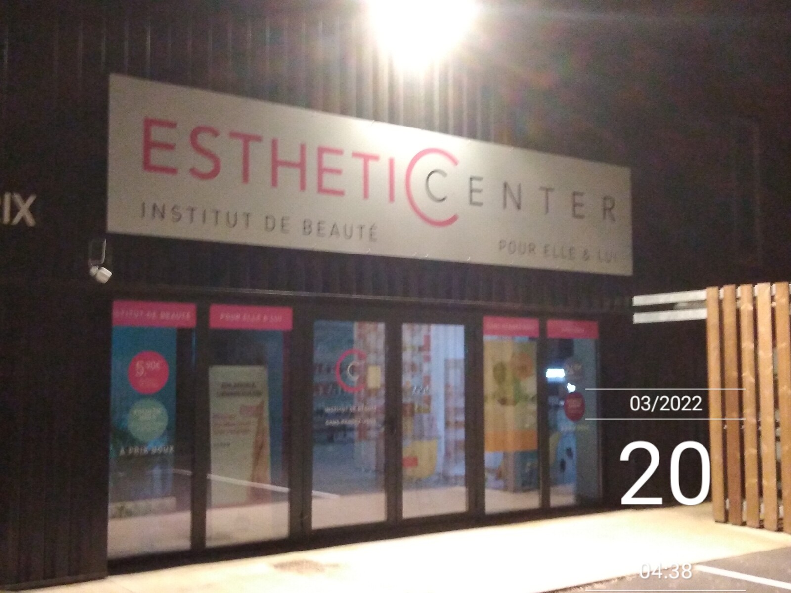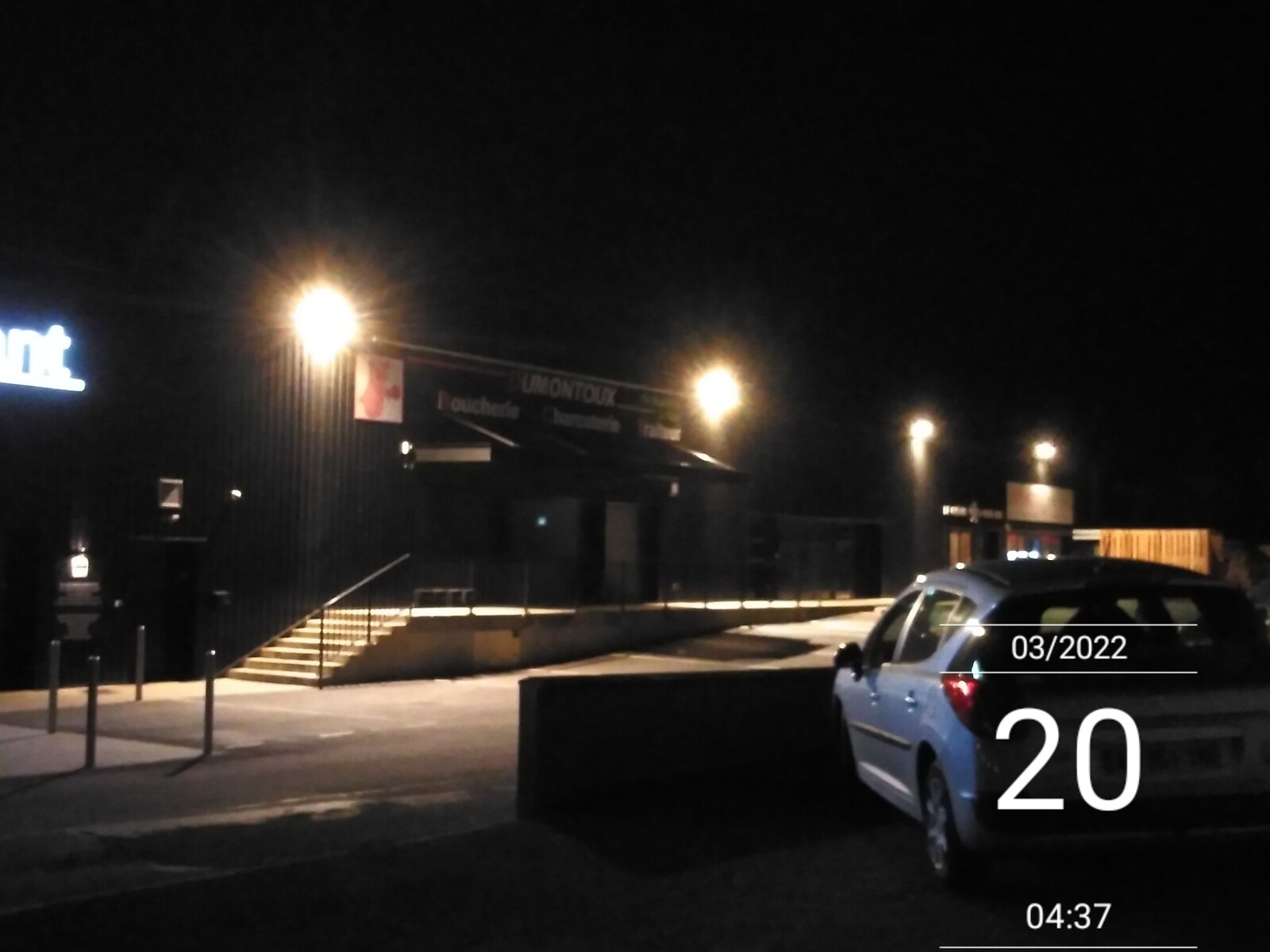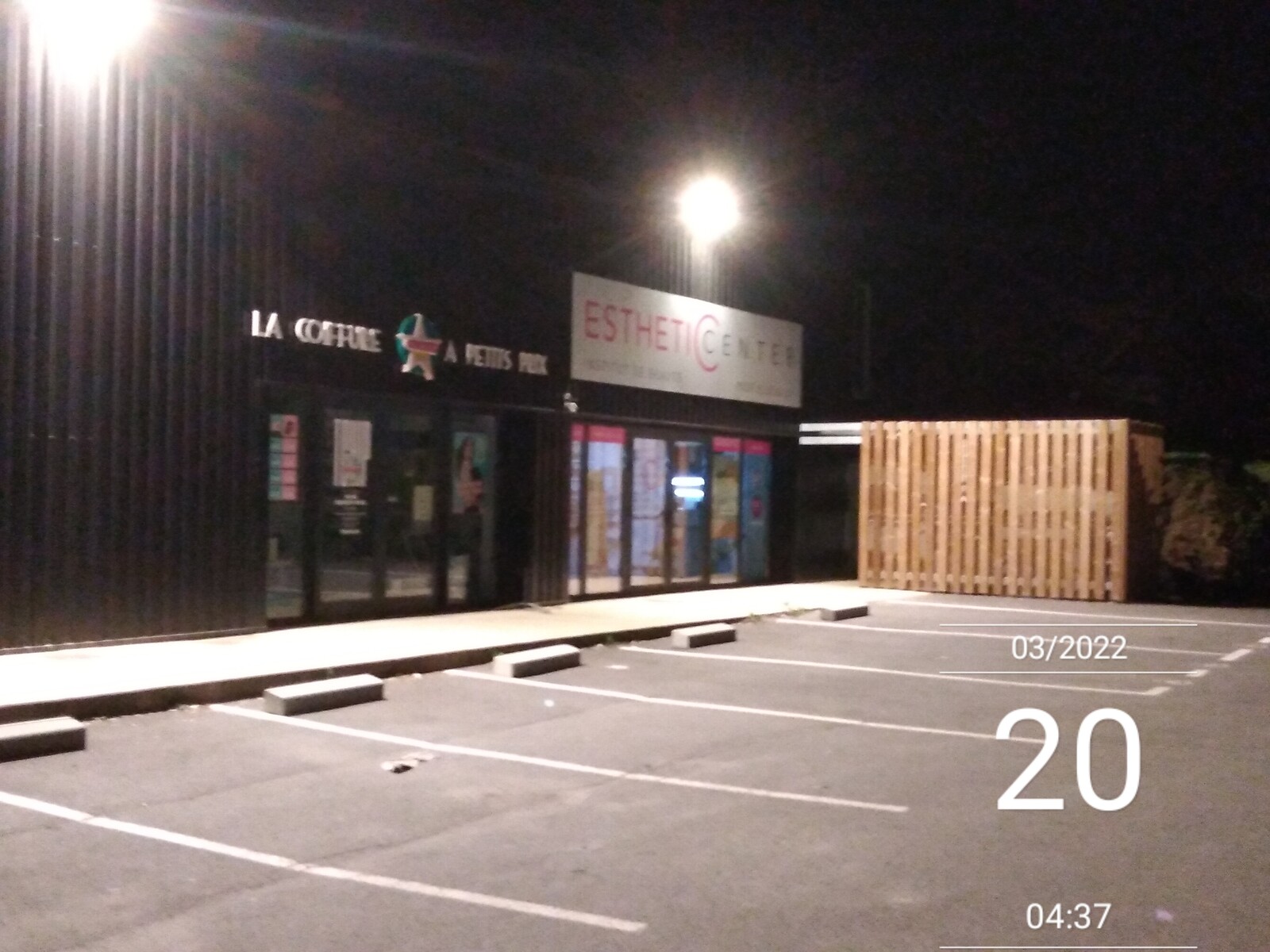 Éclairage des façades de magasins et parking toute la nuit.