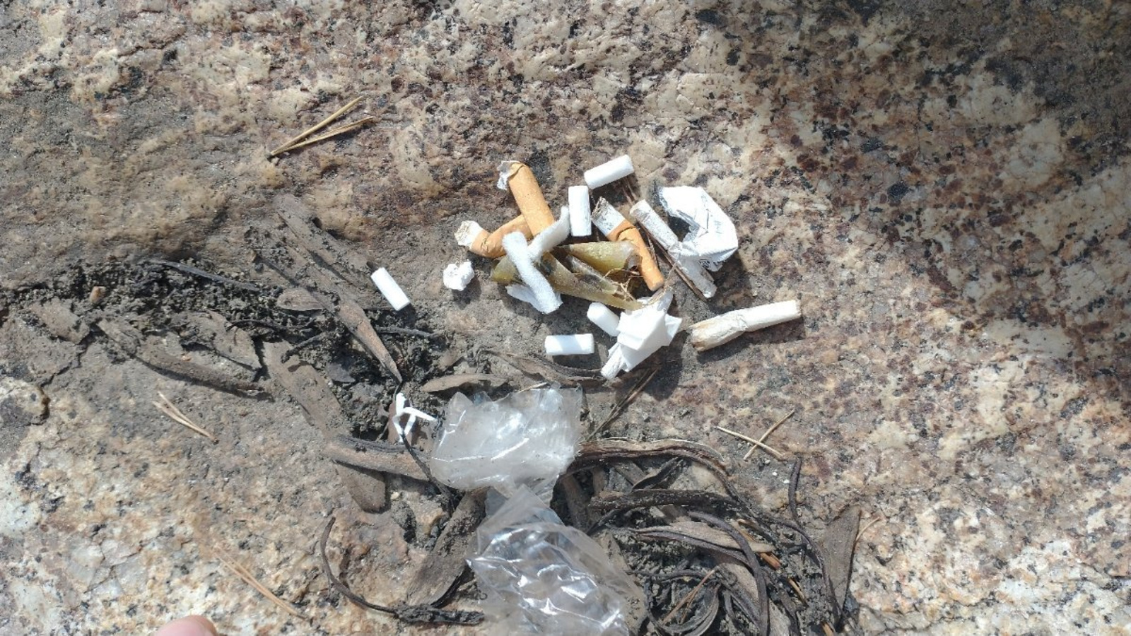Abandon de mégots en période estivale, en zone naturelle. Au delà de la pollution engendrée par ce type de déchets, ces comportements sont à risque dans cette zone et à une période où les incendies peuvent aisément se déclencher.