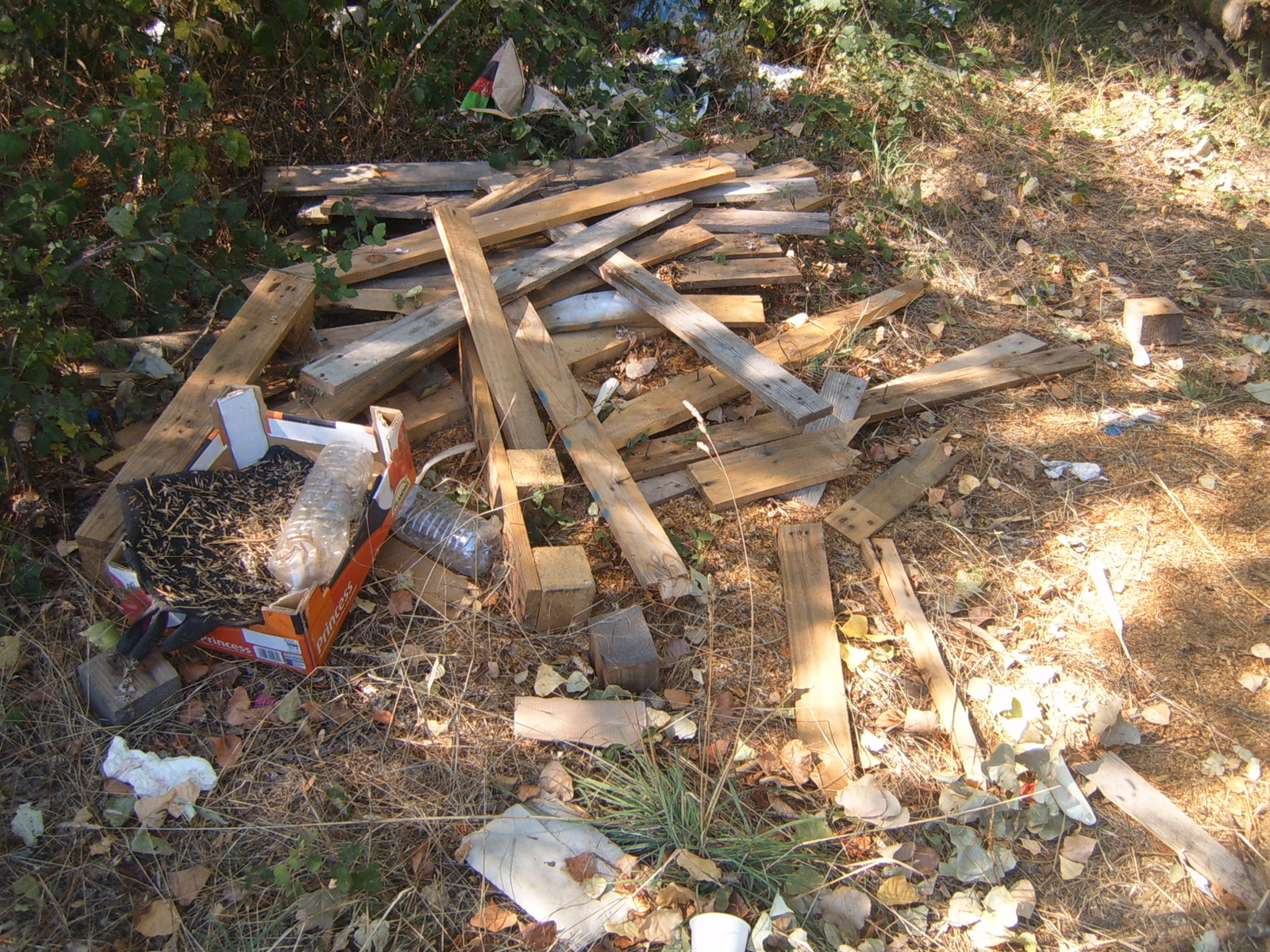 Au Bord de route, sur cette zone, 2 décharges et dépôts constituées de bois, palettes, bouteilles, matières plastiques, matelas mousse, ciment, etc. (Prises de vue du 9 Août 2022).