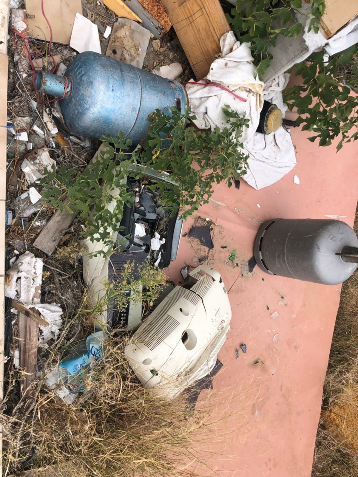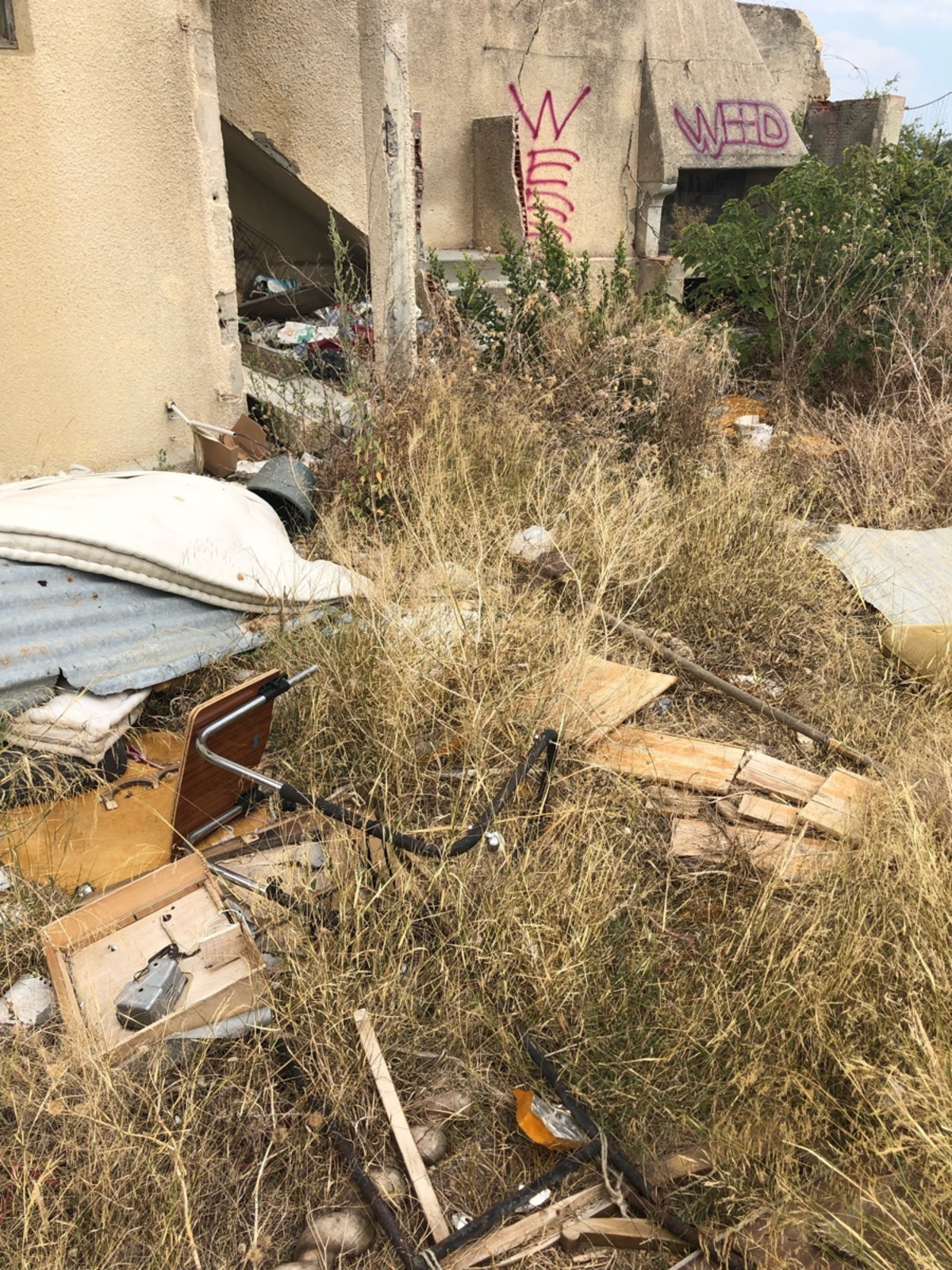 Situation qui comporte des risques de pollution avec de nombreux bâtiments abandonnée remplis de déchets et d'importantes quantités de déchets éparpillés dans les environs.
