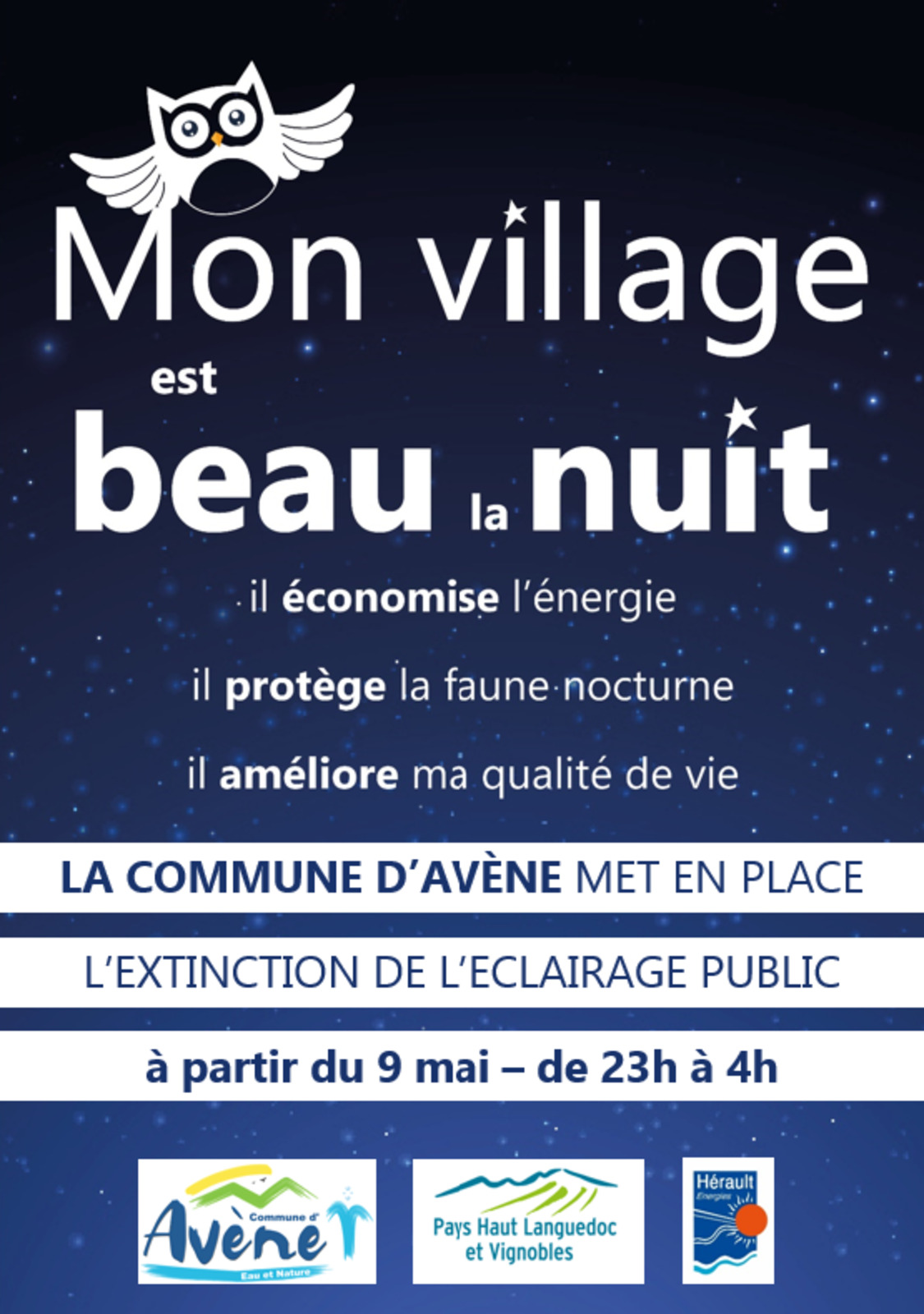 Depuis le 9 mai 2022, la commune d’Avène à mis en place l’extinction des éclairages publics entre 00h et 04h ! Cette mesure vise à réaliser des économies d’énergie, à préserver la faune nocturne, et à réduire les frais de consommation d’électricité pour les réaffecter à d’autres besoins.