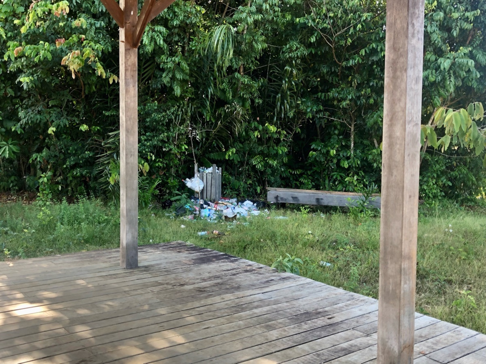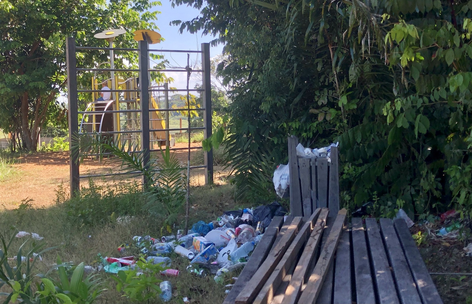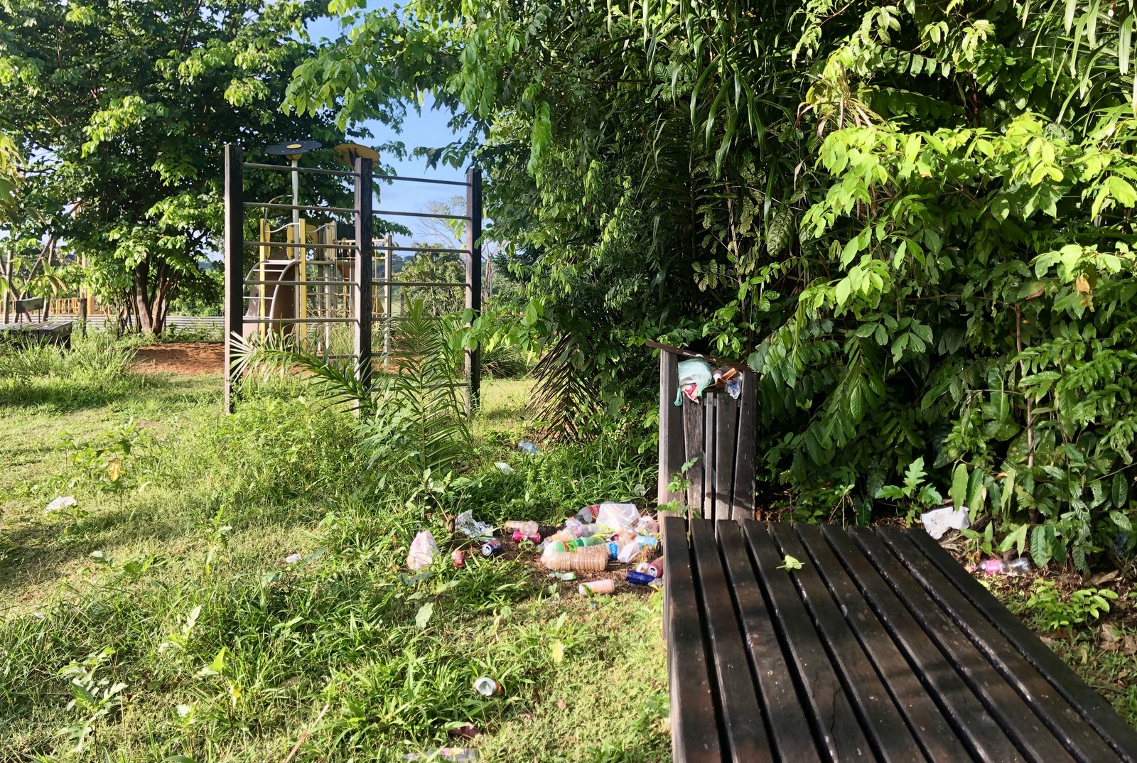 Dépôt de déchets à côté d’une poubelle qui ne semble jamais être ramassée, près d'une aire de jeux pour enfants.