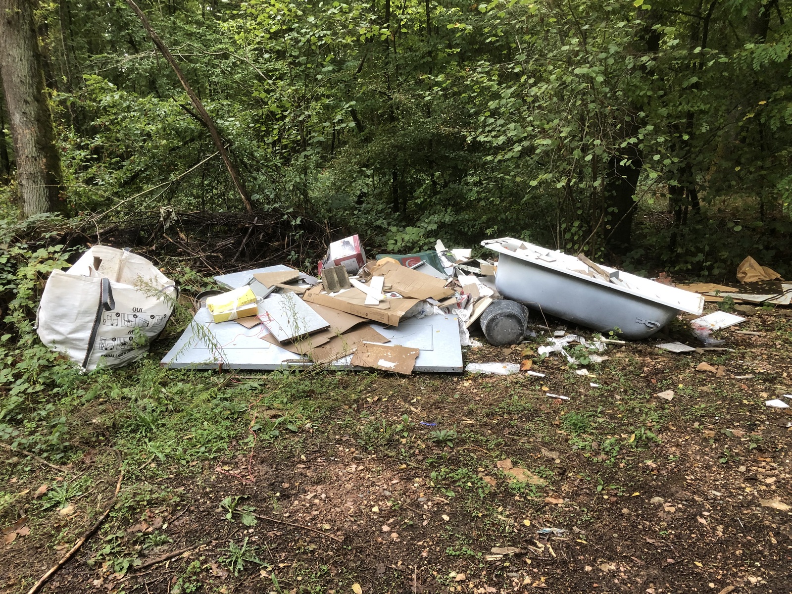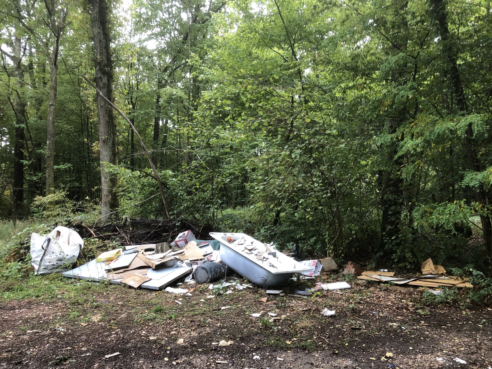 Dépôt sauvage de déchets apparemment récurent : encombrants et matériaux divers.