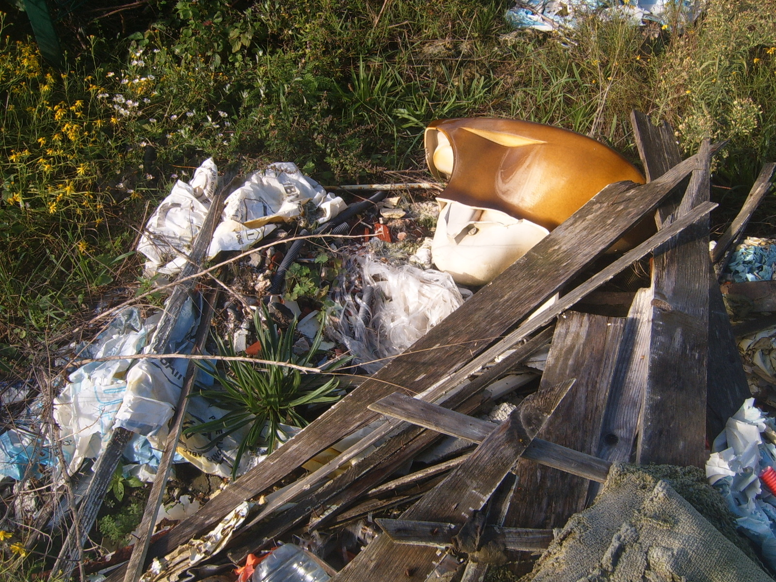 [2020] En Parcelle 0053, derrière le bassin de rétention des eaux pluviales, accessible par le Chemin de Charpieu à Chassieu, une décharge sauvage est constituée de seaux, bâches, isolant, briques, châssis vitrés, revêtements de sol, tuyaux, sanitaire, matières plastiques, palettes, déchets de la construction, etc.