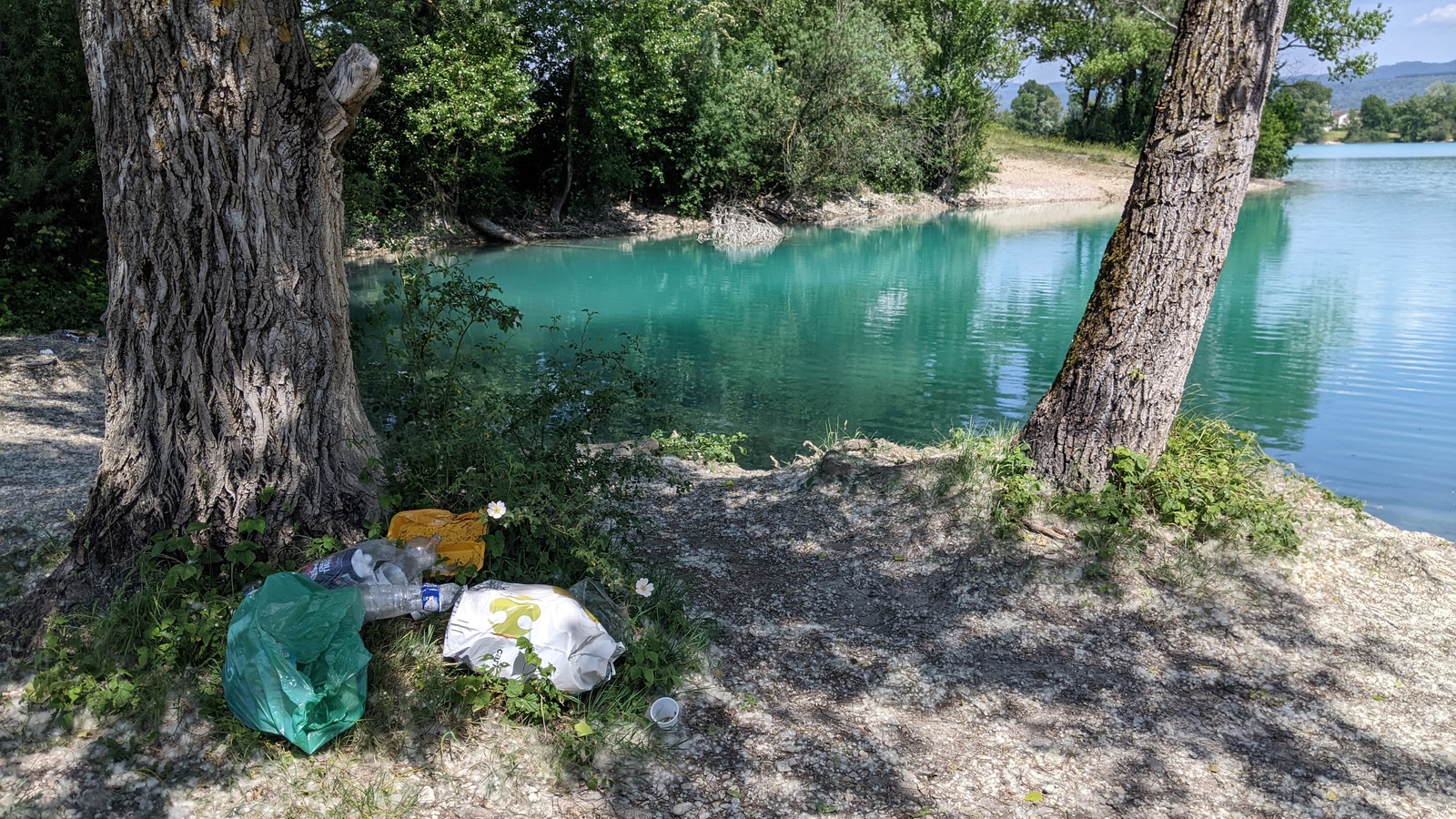 Pendant la période estivale, organisations régulières de ramassage des déchets autour du Lac du Vorgey qui est quotidiennement souillé de restes de barbecue, de canettes de bière, de sacs plastiques ...