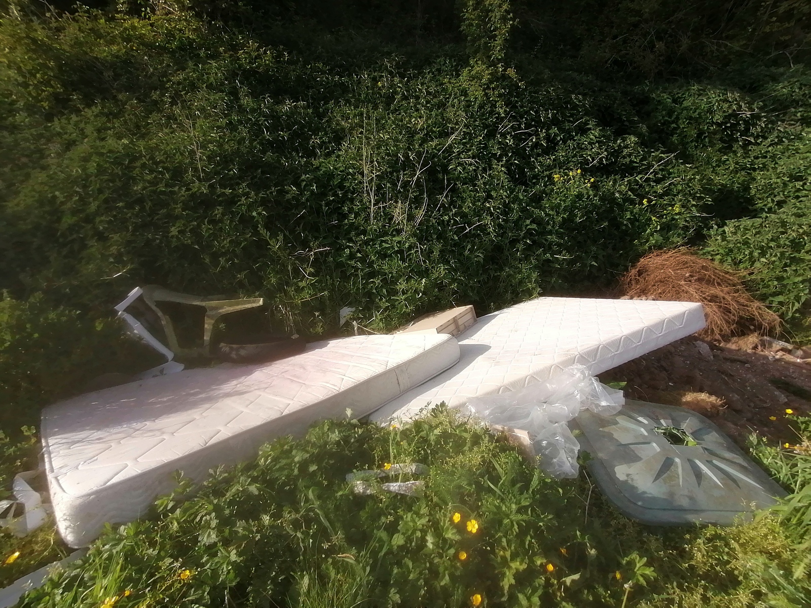 Important dépôt de déchets (matelas, sommier, éléments de mobiliers et de bureau en plastique, déchets verts, ferrailles, bois, etc.).