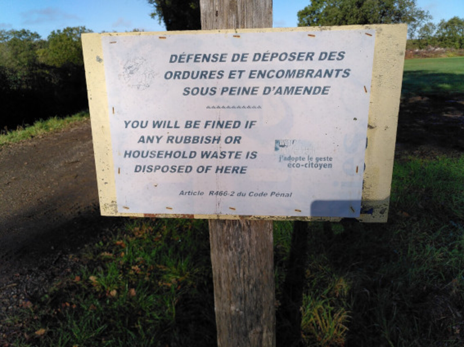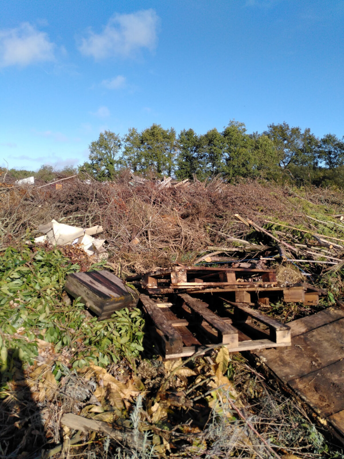 Un volume très important de déchets (essentiellement des déchets verts mais aussi du bois, des plastiques etc.) est entreposé sur un terrain agricole en bord d'un chemin. Un panneau interdisant le dépôt de déchets à cet endroit est installé depuis manifestement beaucoup plus longtemps que les derniers apports, encore bien verts le jour de la constatation.