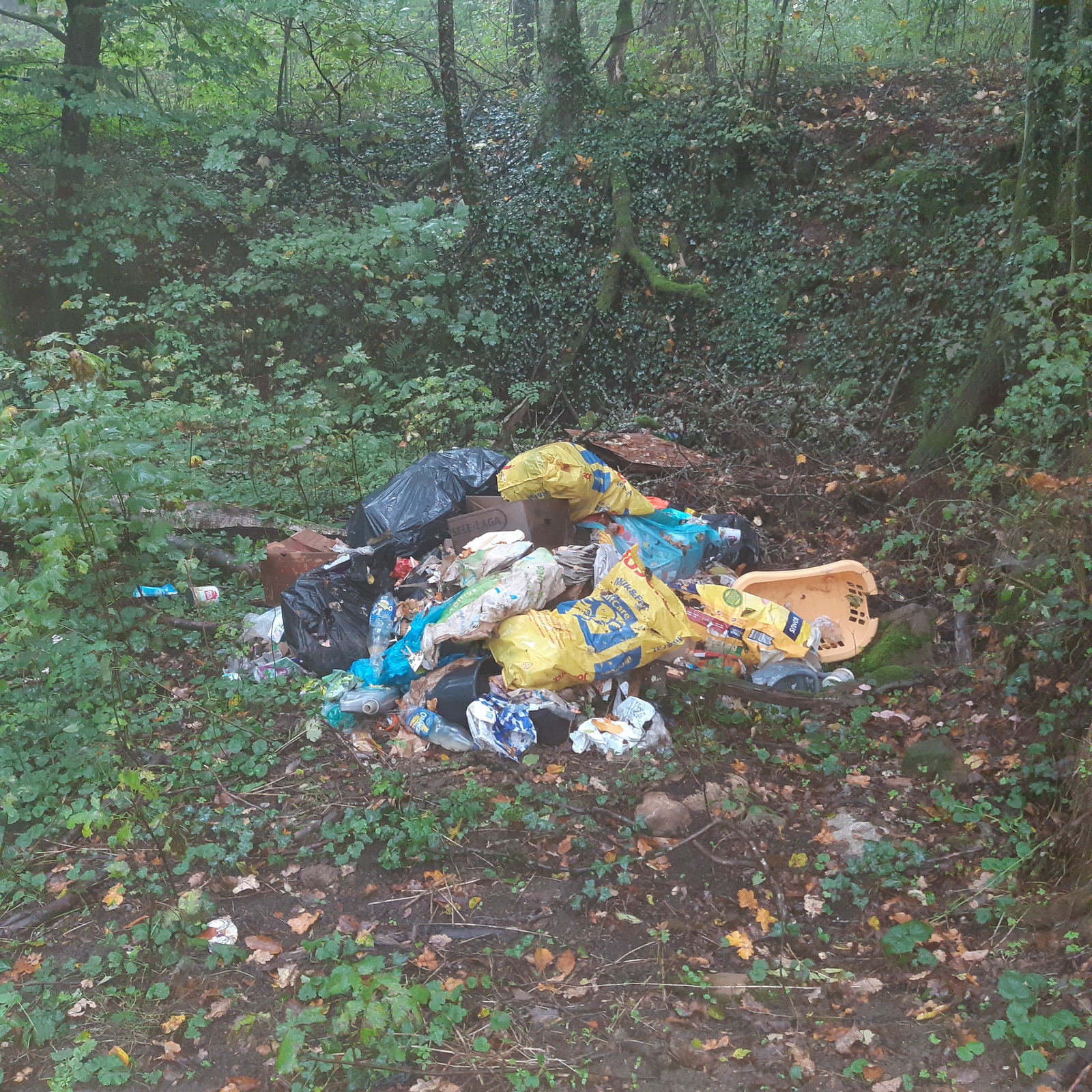 Dépôt de déchets composé essentiellement d'ordures ménagères, des boites de conserve, des bouteilles, sacs, pots de yaourts, barquettes en plastique, des bouteilles en verre, des boites de médicaments, des emballage de produits alimentaires, des bidons d'huile...
