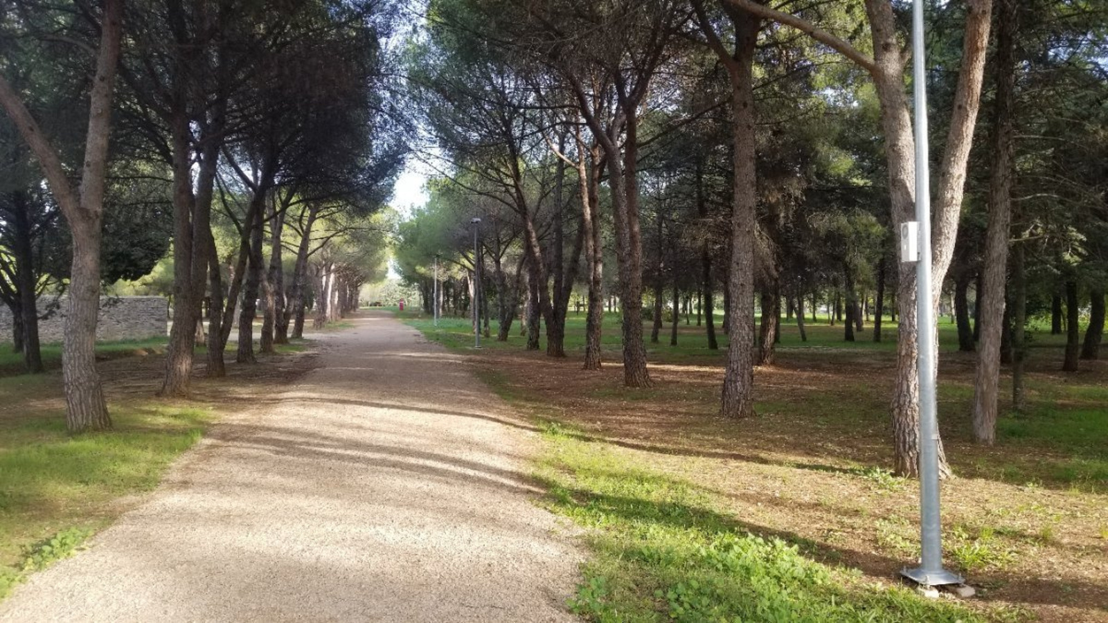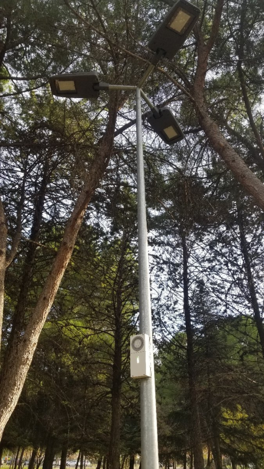 Installation de lampadaire avec boîtiers de détection de passage installés dans le parc arboré du domaine d'Ô à Montpellier.