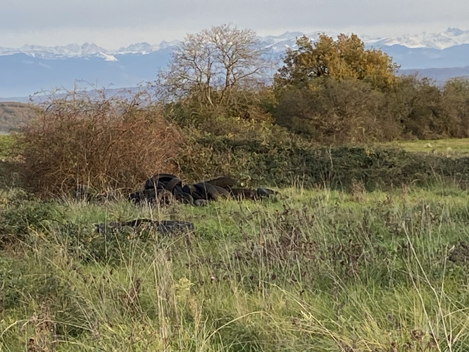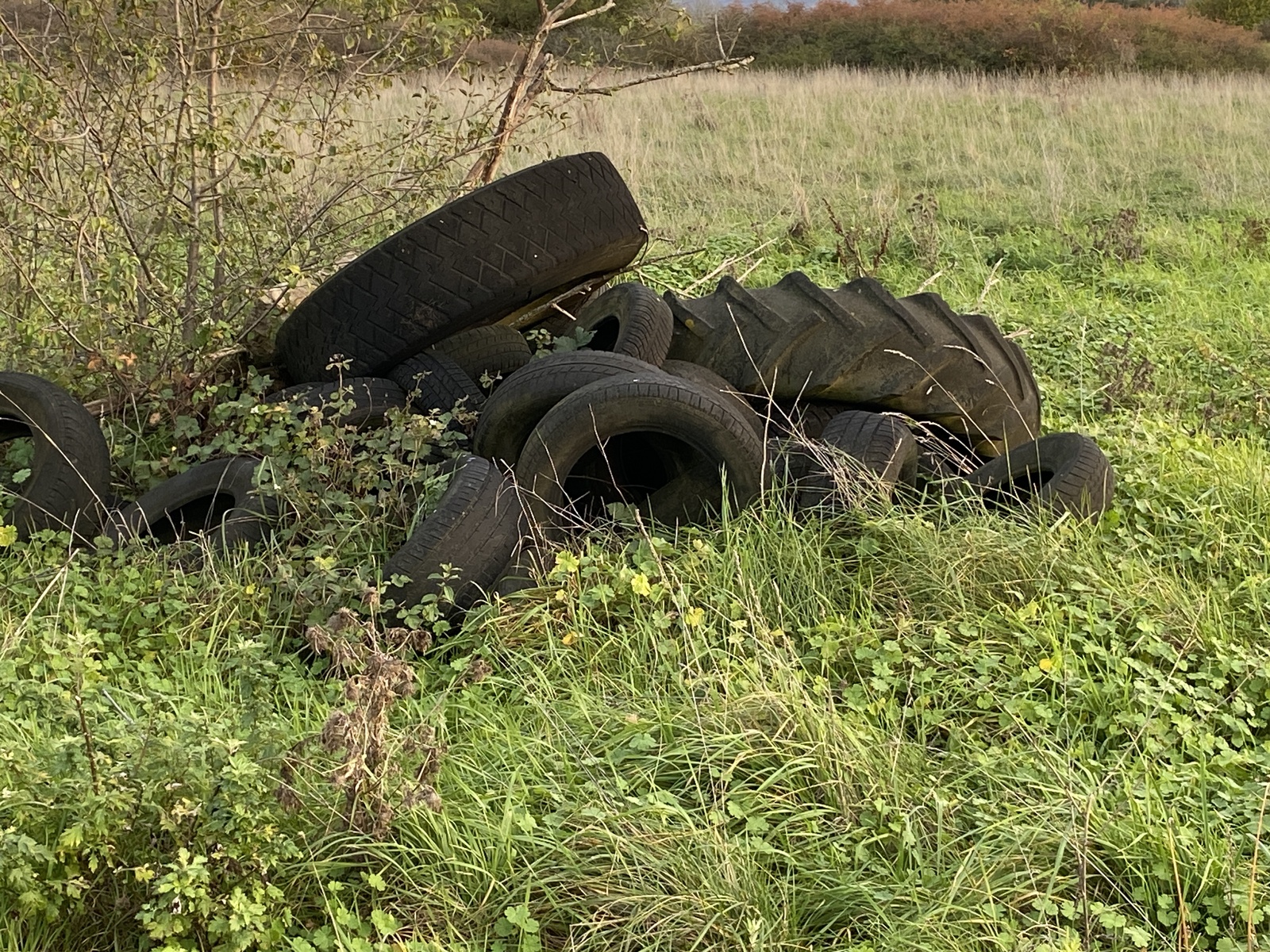 Dépôts éparses de pneus de tracteurs dans le champs sur environ 200m2 par petits tas, ainsi que dans les buissons.
