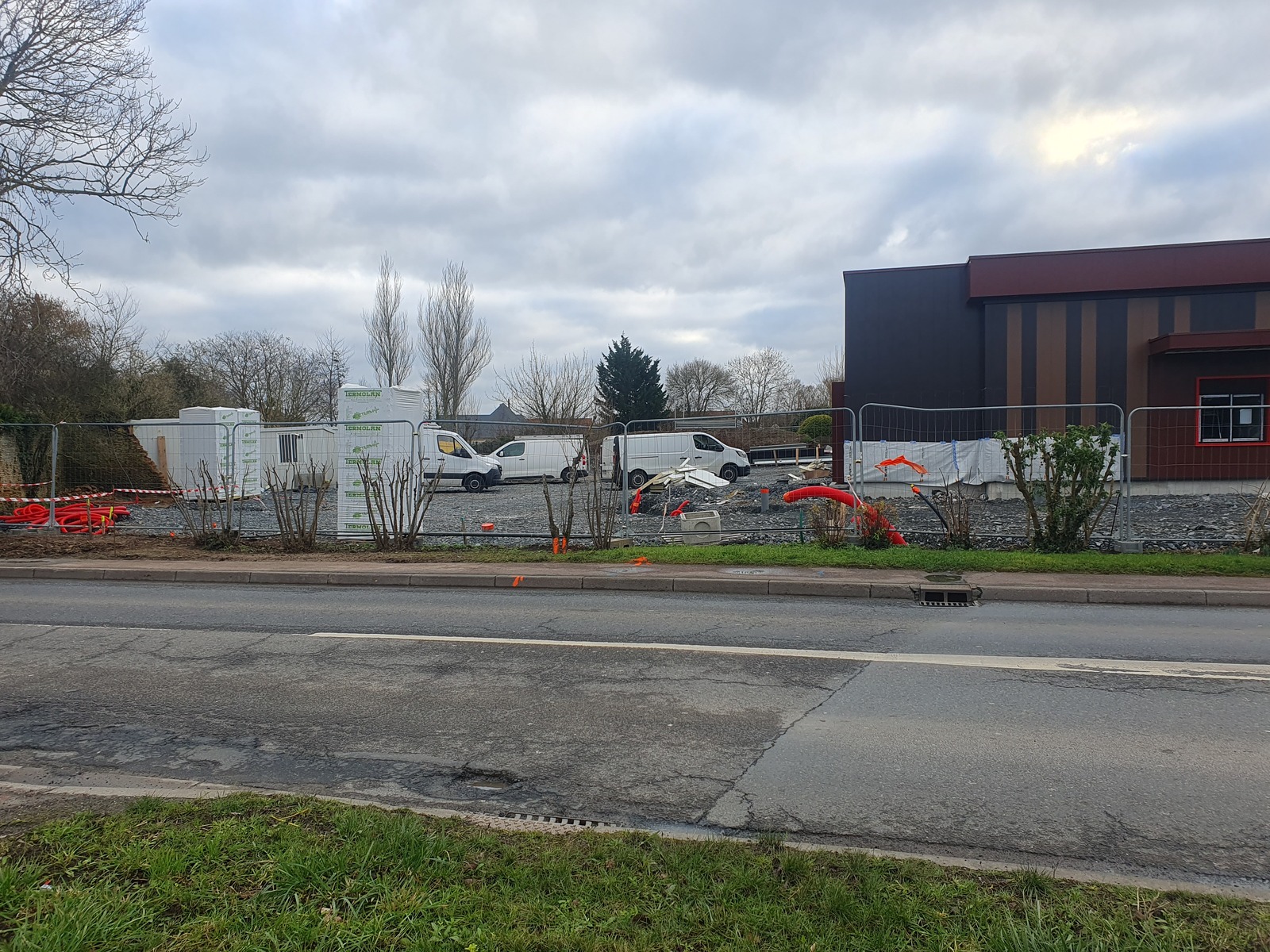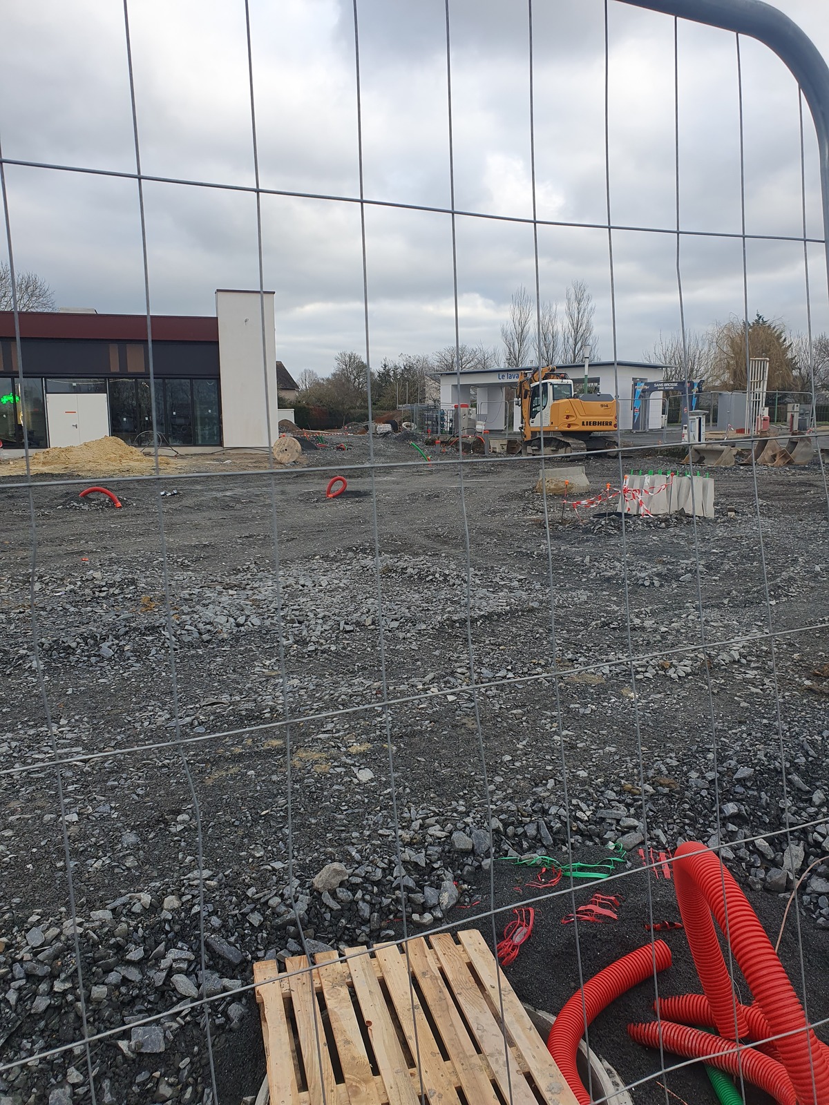 Un permis de construire a été accordé à une société pour la construction d'un restaurant. La haie existante devait semble-t-il être conservée ainsi que le maximum d'espace vert. A ce jour, tout a été rasé. Aucun arbre n'a été conservé et tout a été recouvert d'environ 50cm de tout-venant.
