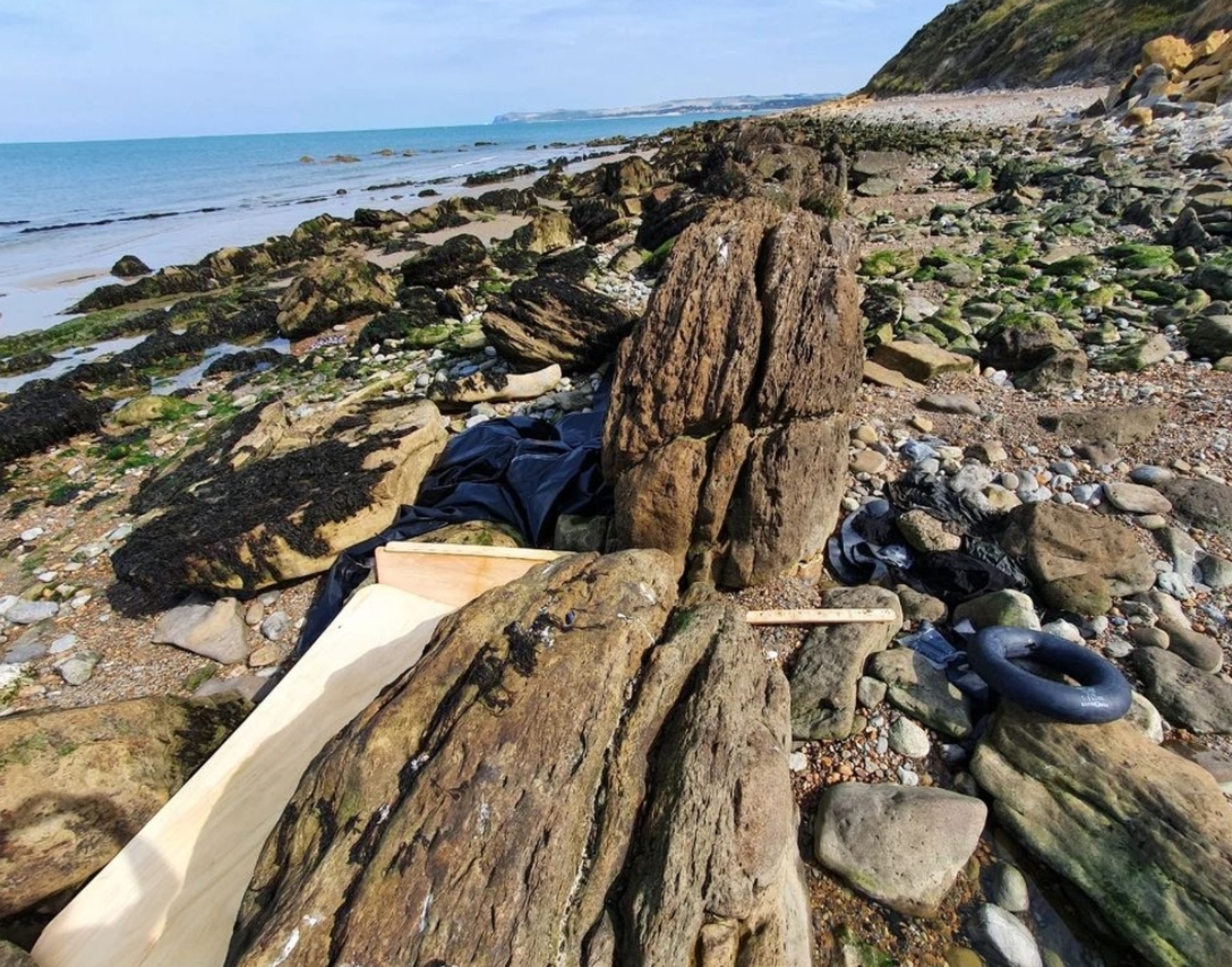 Zodiac dégonflé, bouée et vêtements abandonnés sur la plage