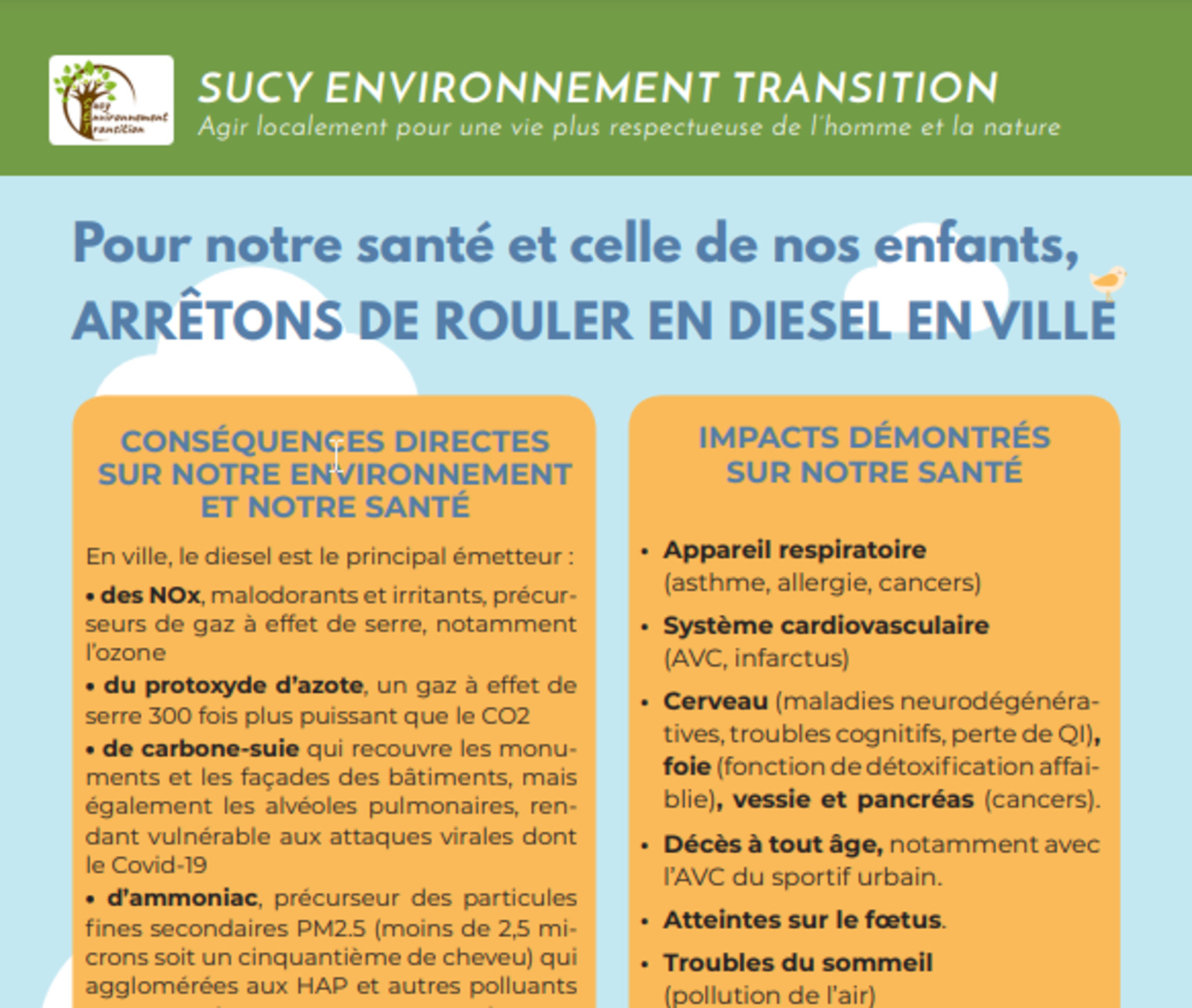 L’association Sucy Environnement Transition propose l’atelier « Comment quitter son véhicule à moteur diesel » afin d’anticiper l’interdiction de circulation des véhicules diesel dans le périmètre de la zone à faibles émissions (ZFE) de la Métropole du Grand Paris (puis dans de nombreuses autres métropoles françaises et européennes).