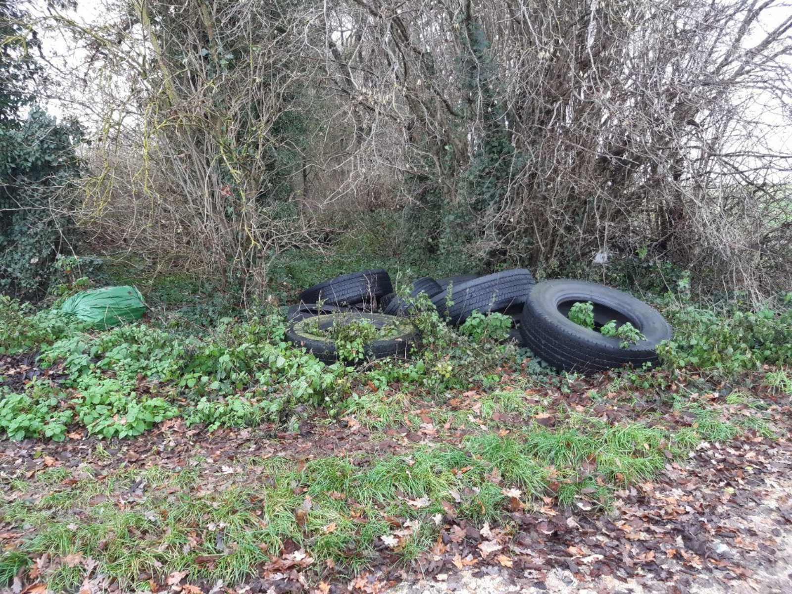 Décharge sauvage de pneus de camions au bord d'un bois à Blangy-Tronville