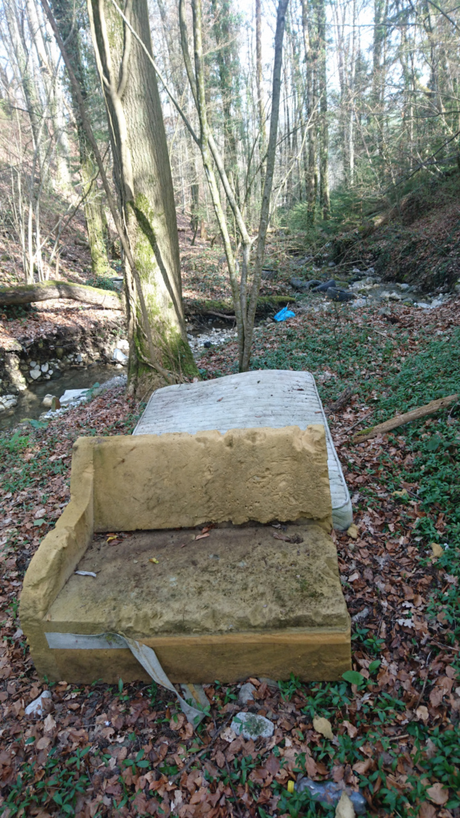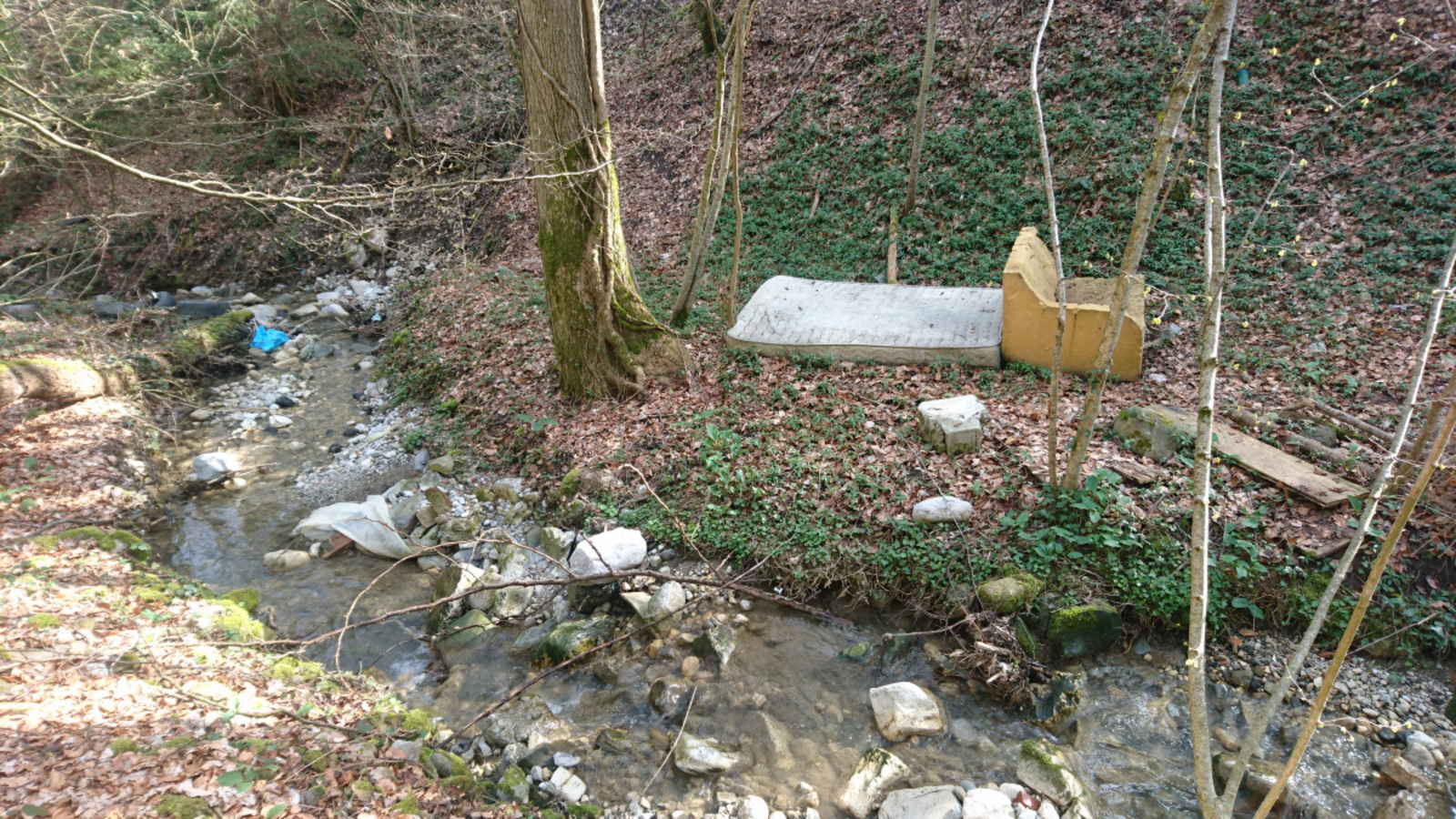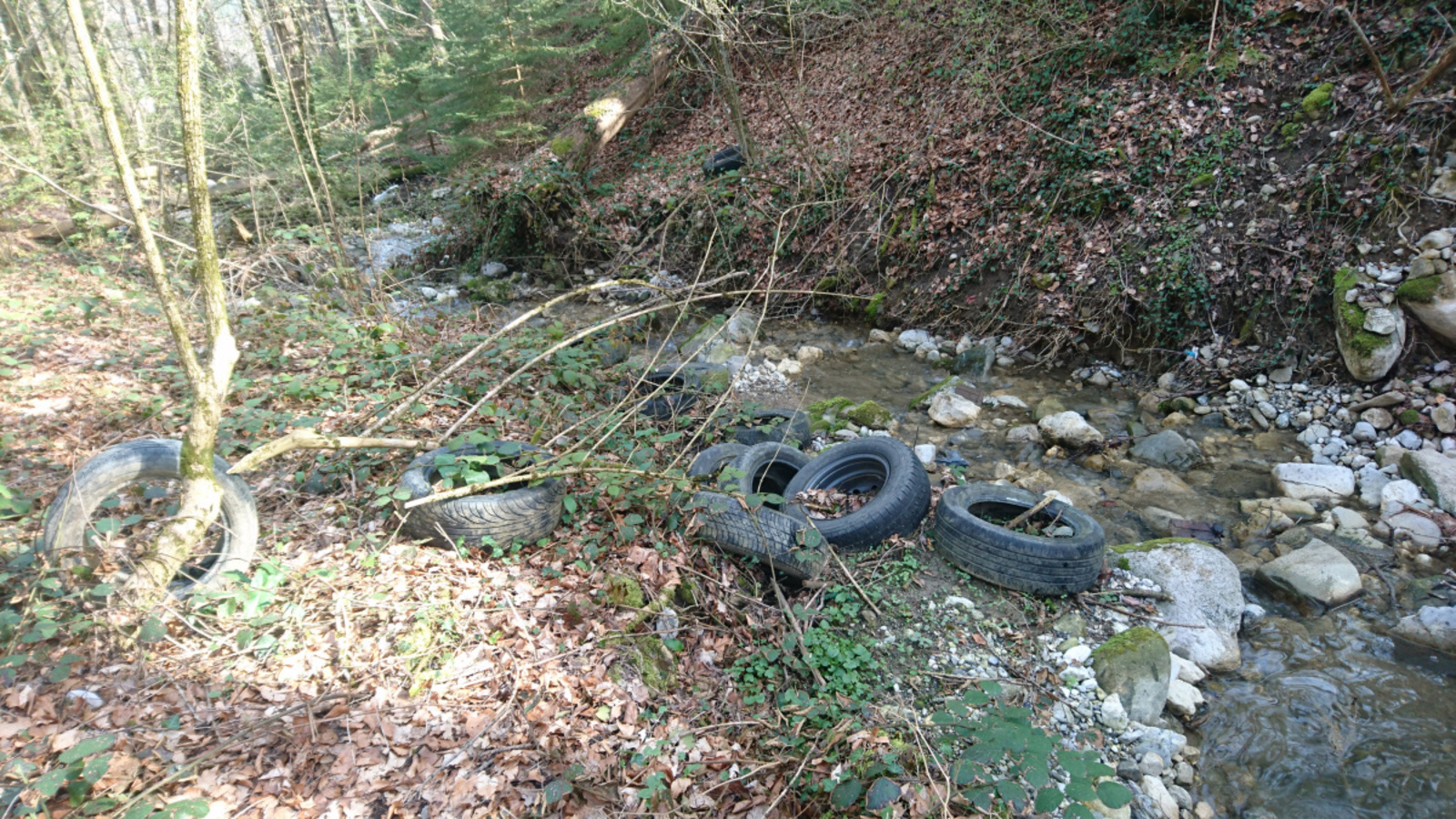 Dépôt de déchets en tous genre en aval de la déchetterie et dans le lit de la rivière. Présence de pneus, canapés,...