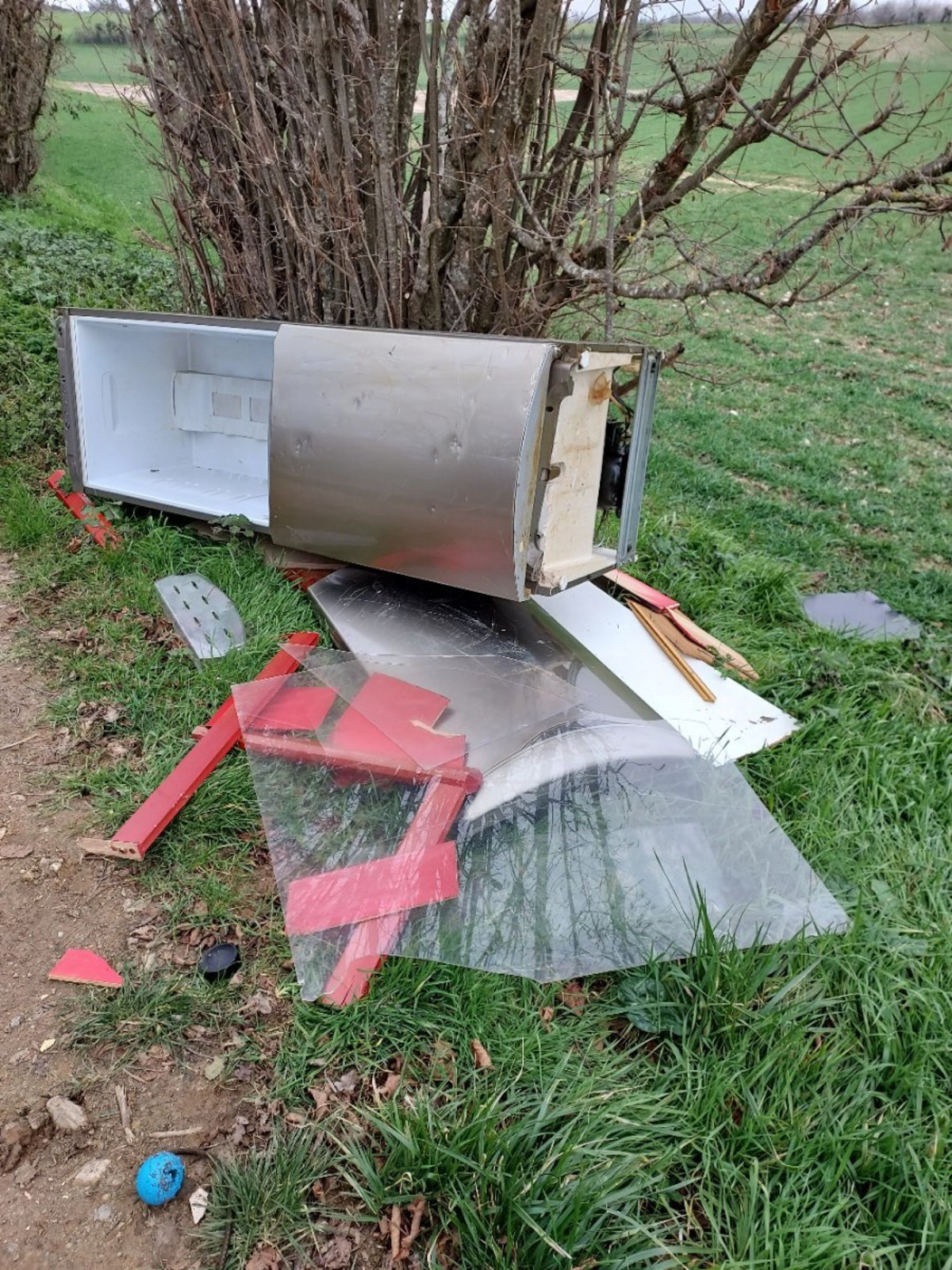Frigo, plexiglas et bois déposé dans le chemin qui va de la route de Villefontaine au parc de Fallavier