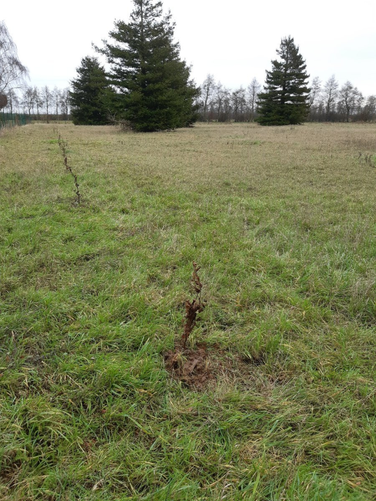 Arbres achetés et plantés dans une zone d'herbe abandonnée entre un cimetière militaire et une autoroute, sur le territoire de la commune de Marcelcave.