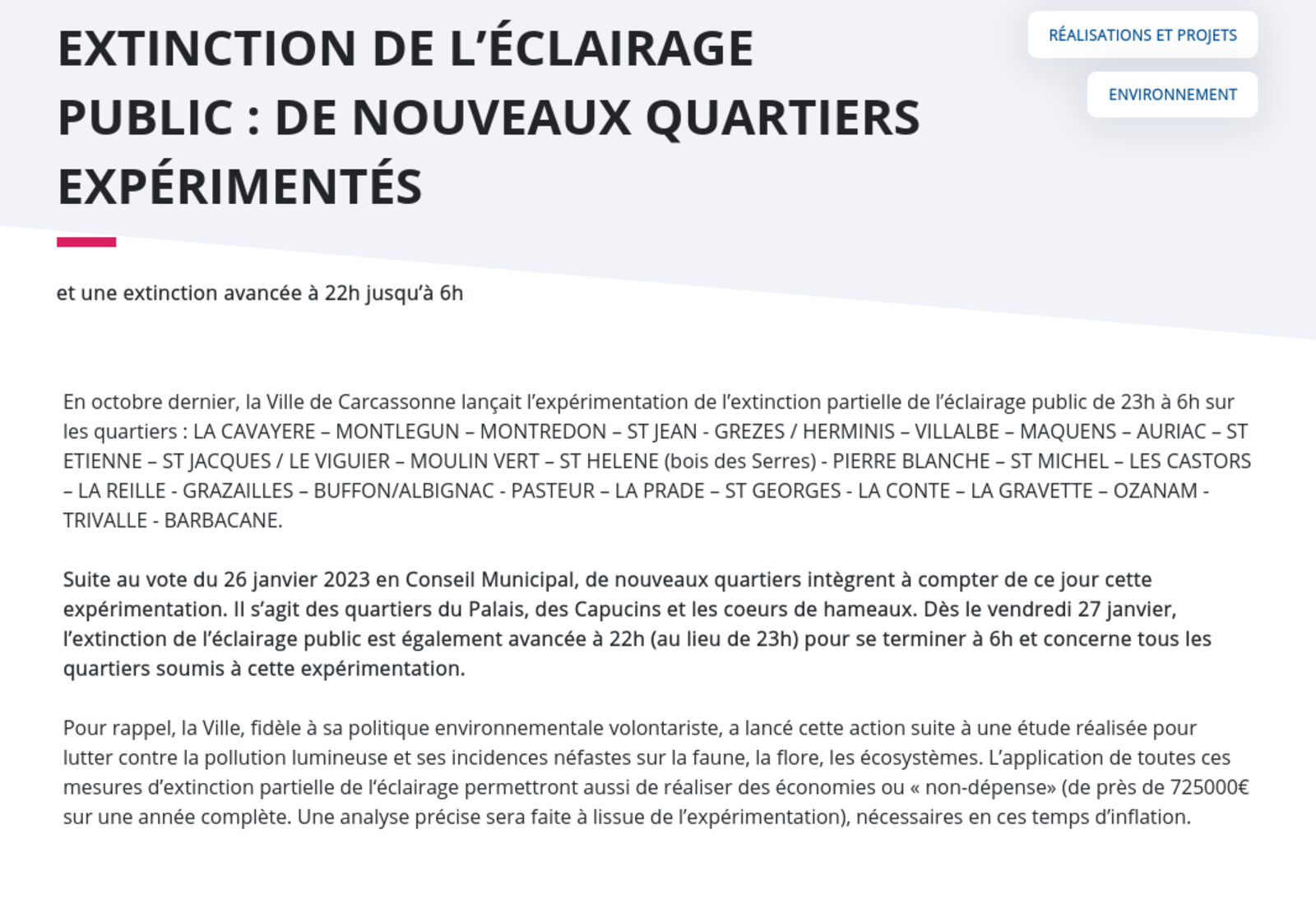 Expérimentation pour plusieurs quartiers de Carcassonne : extinction de l'éclairage public la nuit.