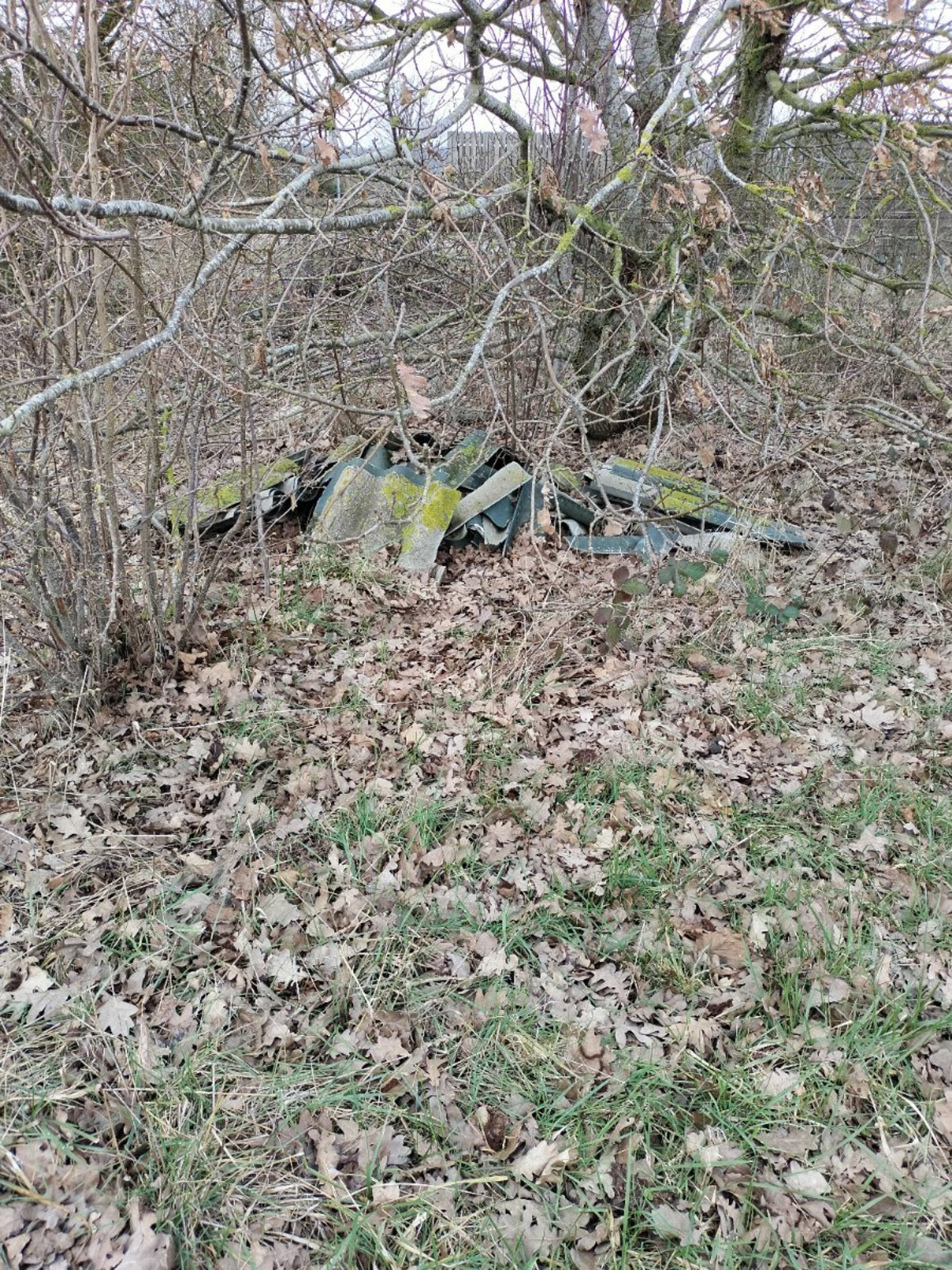 Dépôt sauvage constitué de tôles de fibrociment laissées en bordure d'un chemin agricole le long de l'autoroute A29.
