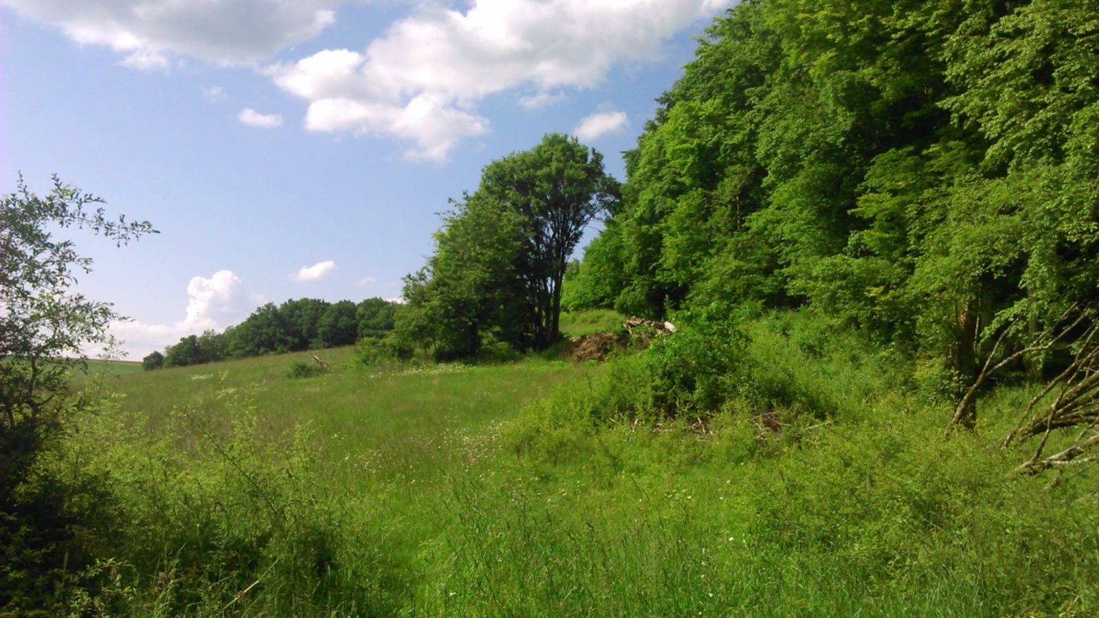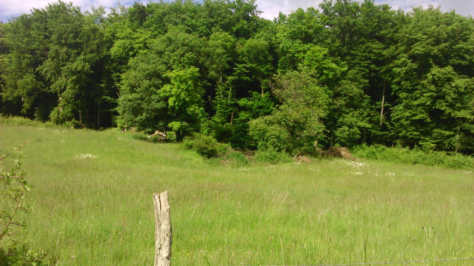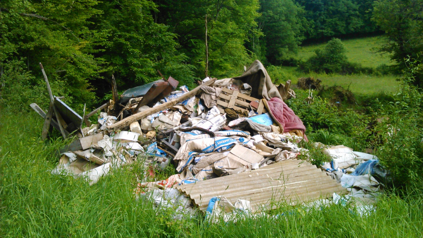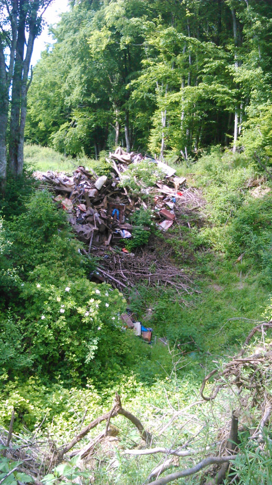 Un agriculteur semble avoir vidé le contenu de son grenier dans une fosse au fond d'un pré en lisière de forêt : un amas hétéroclite de vieux objets (valises, tiroirs, matériel d'attelage de chevaux de trait, vieux livres, bouts de plastique...)