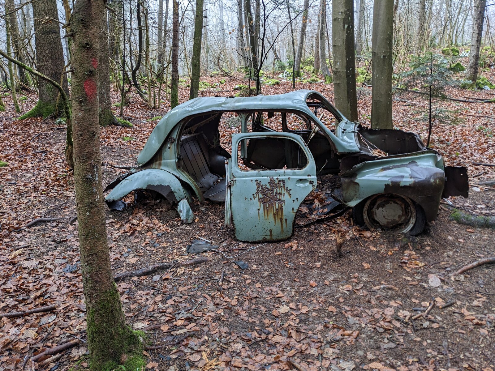 Carcasse de voiture présente depuis de nombreuses années, plus de moteur.