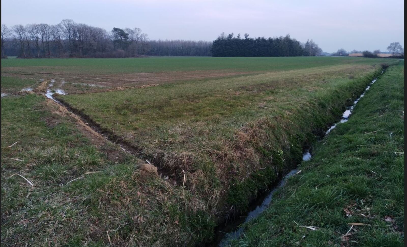 creusement d'un fossé à travers une bande enherbée, permettant d'évacuer l'eau s'accumulant dans une parcelle agricole vers un cours d'eau BCAE