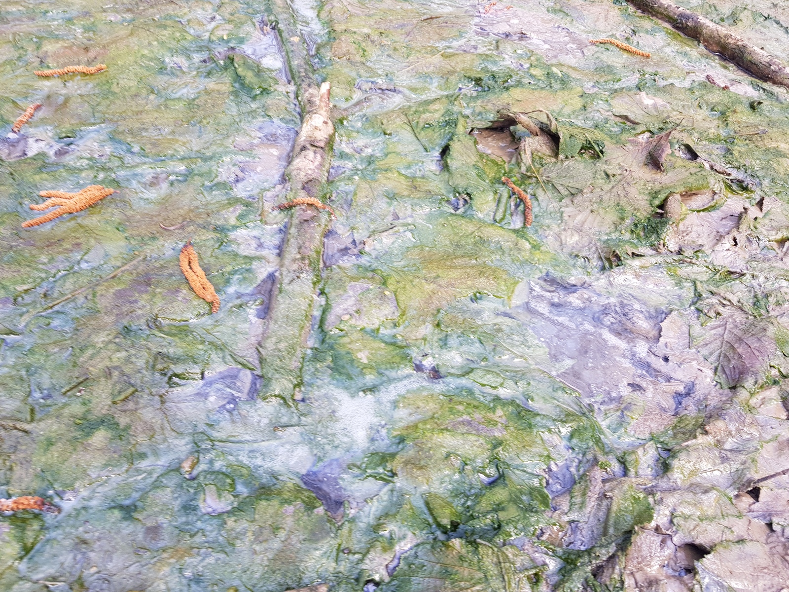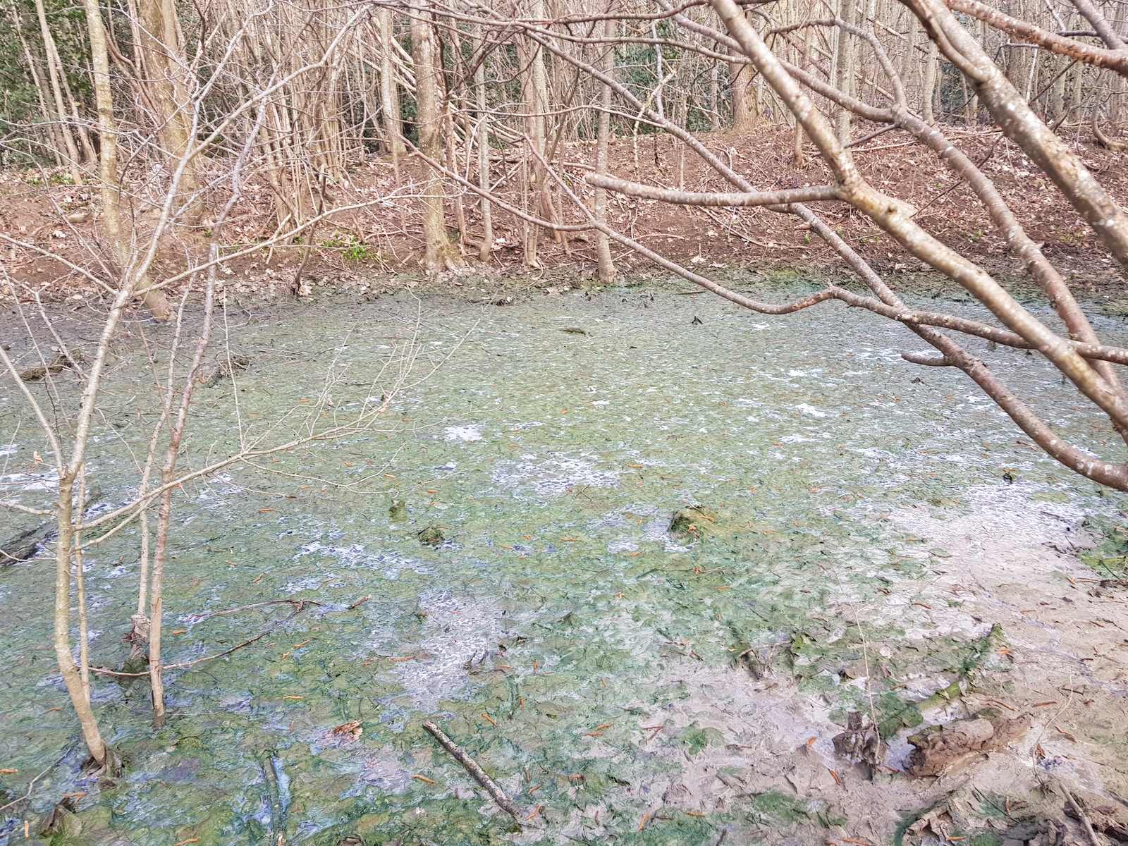 Petite zone humide, couverte d'algues vertes avec formation de mousse, située à proximité du cours d'eau le Lanfrey et d'une exploitation agricole.