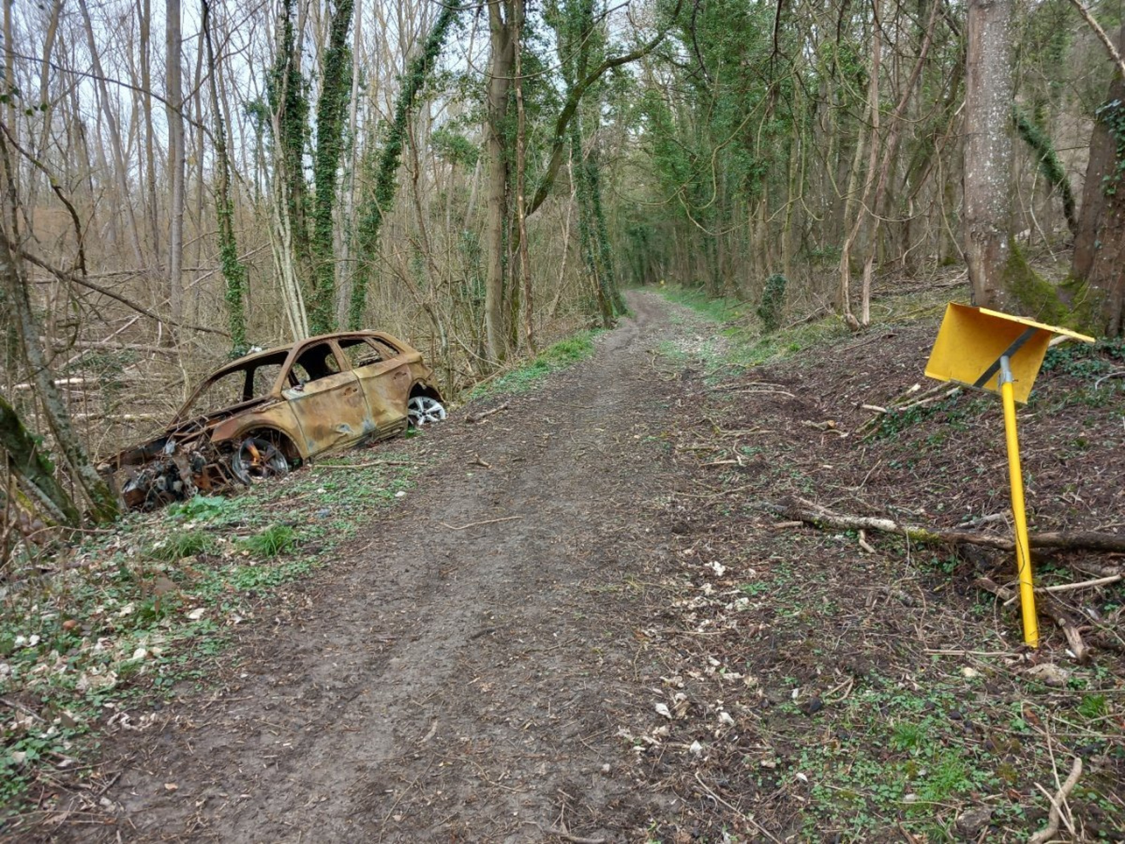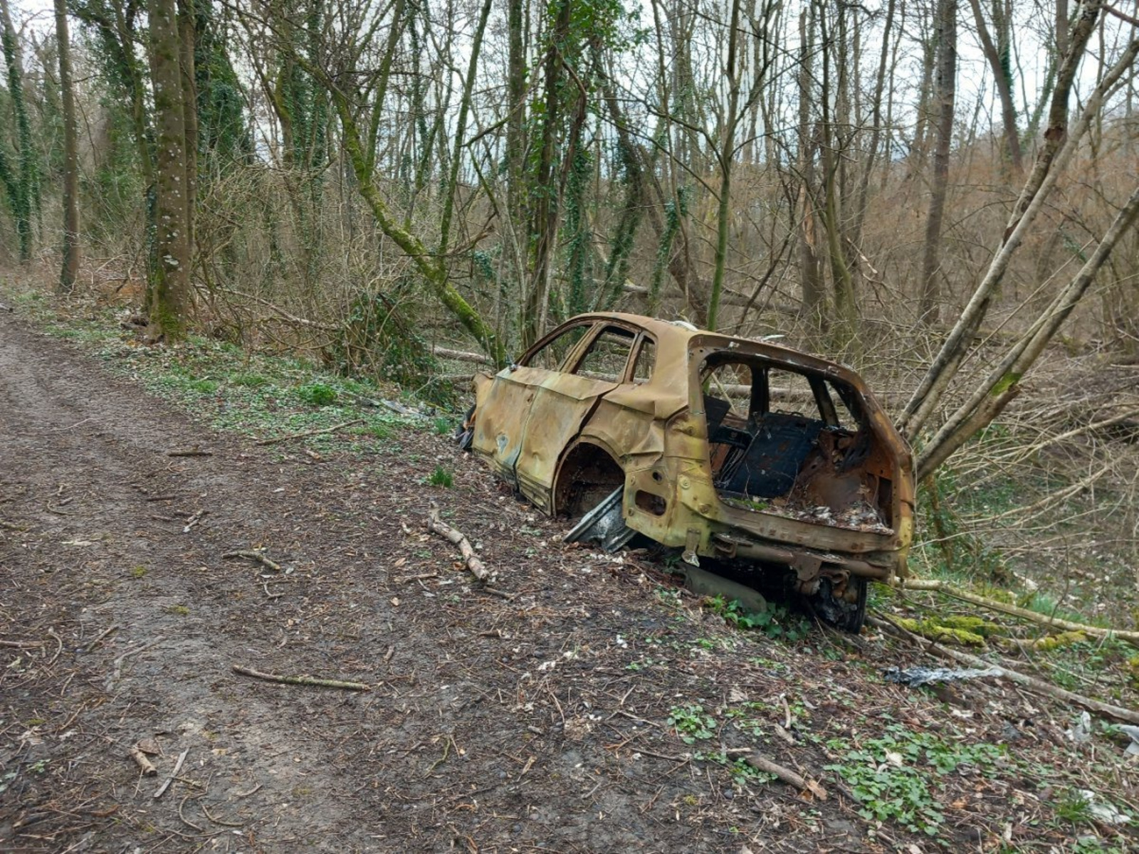 Un véhicule brûlé est abandonné, depuis plusieurs mois, dans un espace boisé. Ce véhicule est situé sur le domaine public.