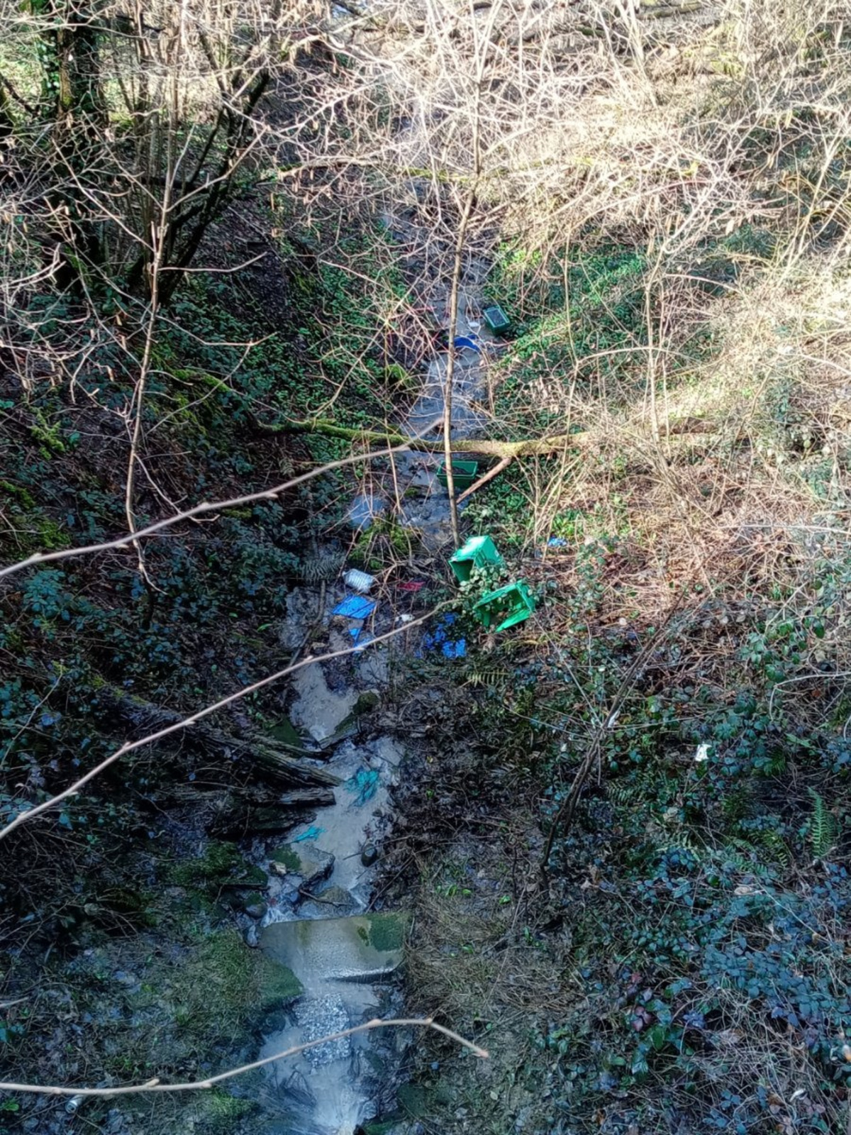 Dépôt de bac en plastique et autres déchets jetés dans un ruisseau depuis la route.