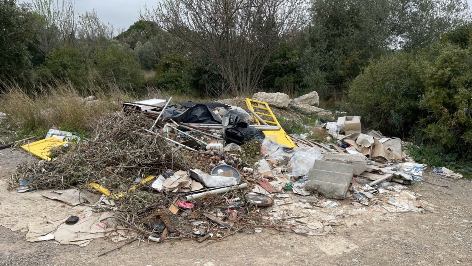 Dépôt sauvage de déchets dans la garrigues, le long d’une petite route longeant l’autoroute
