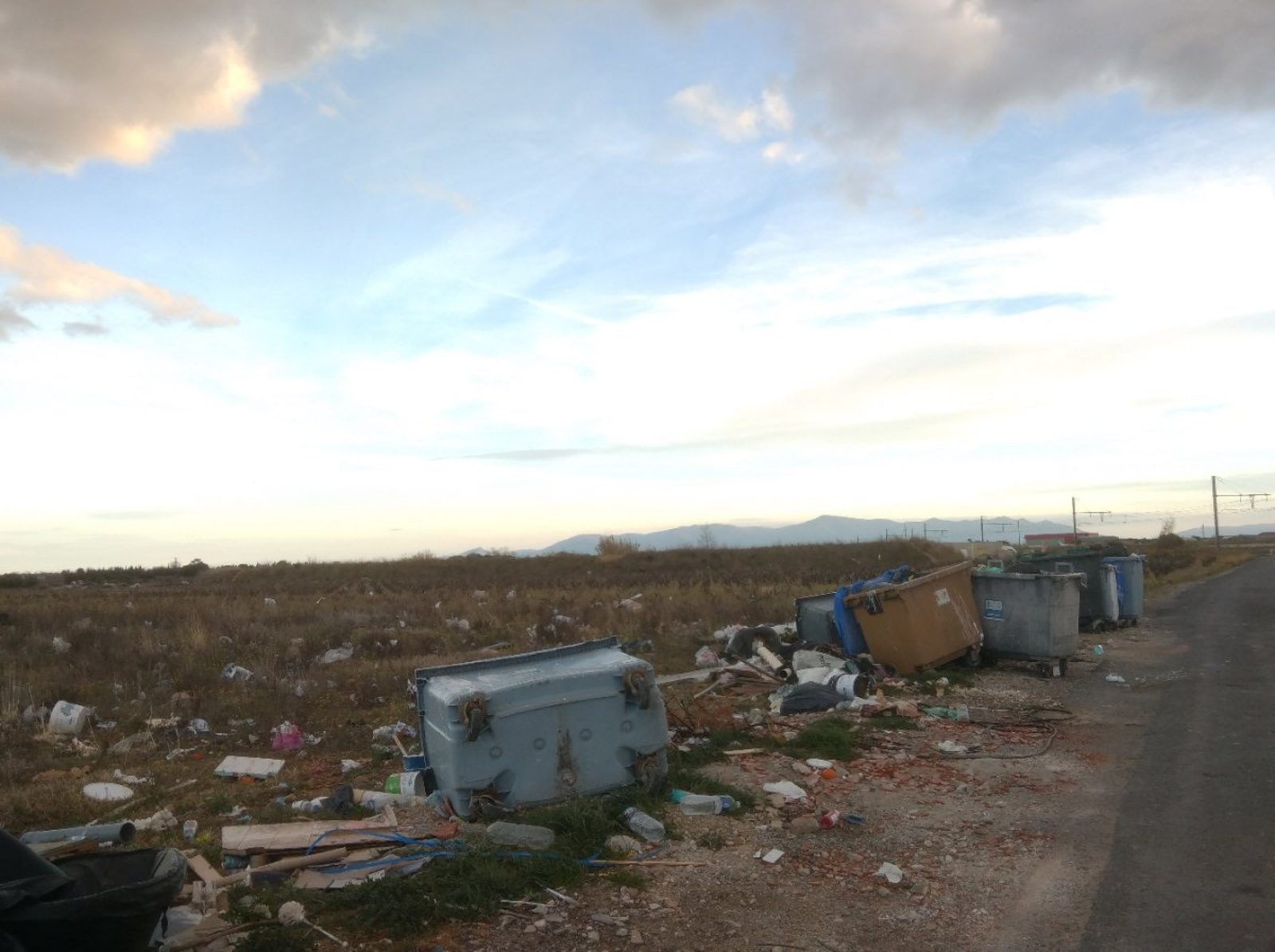Nombreux dépôts de déchets le long d'une route passant entre des terrains agricoles.