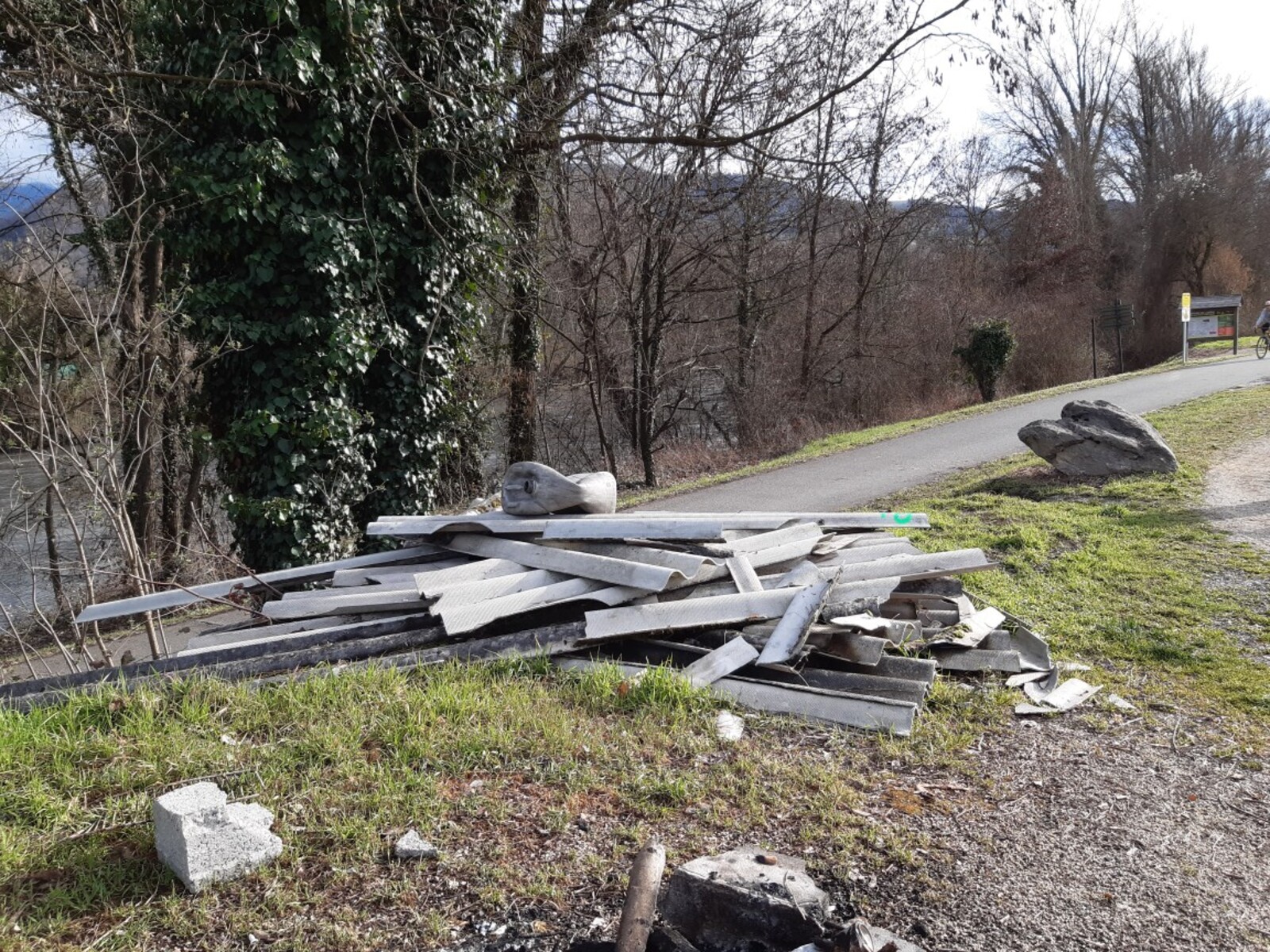 Dépot de dechêts en pleine nature à l'aire de pique nique le long de la piste cyclable