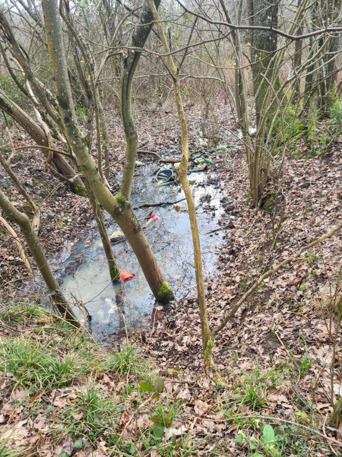 Pollution d'une mare par des déchets et autres substances