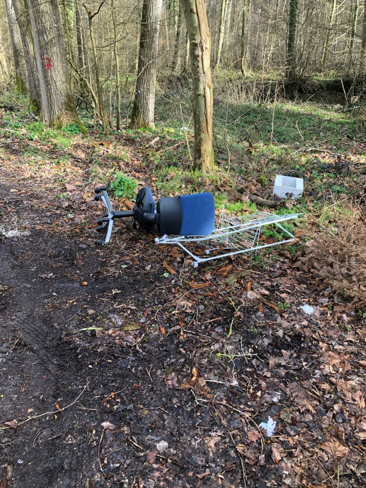 Dépôt sauvage de déchets, constitué d'une chaise de bureau, d'un étendoir et d'une table de chevet, présent à la lisière d'un bois sur la commune d'Avricourt.
