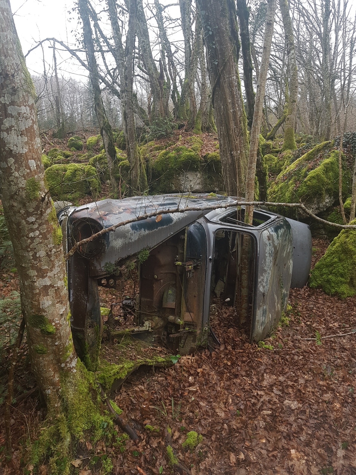 Une vieille carcasse de voiture sur le flanc, prise dans la végétation, sans le moteur