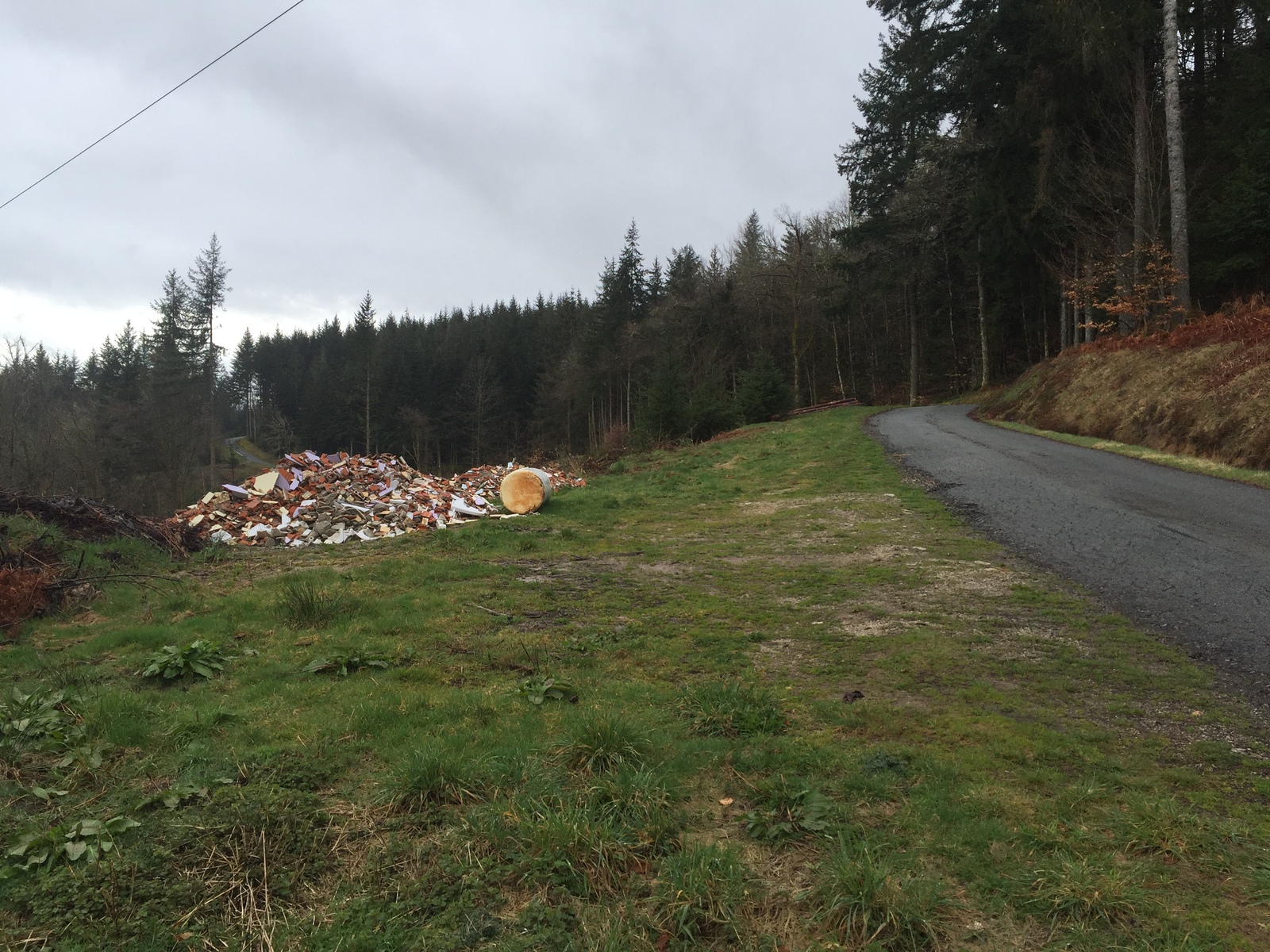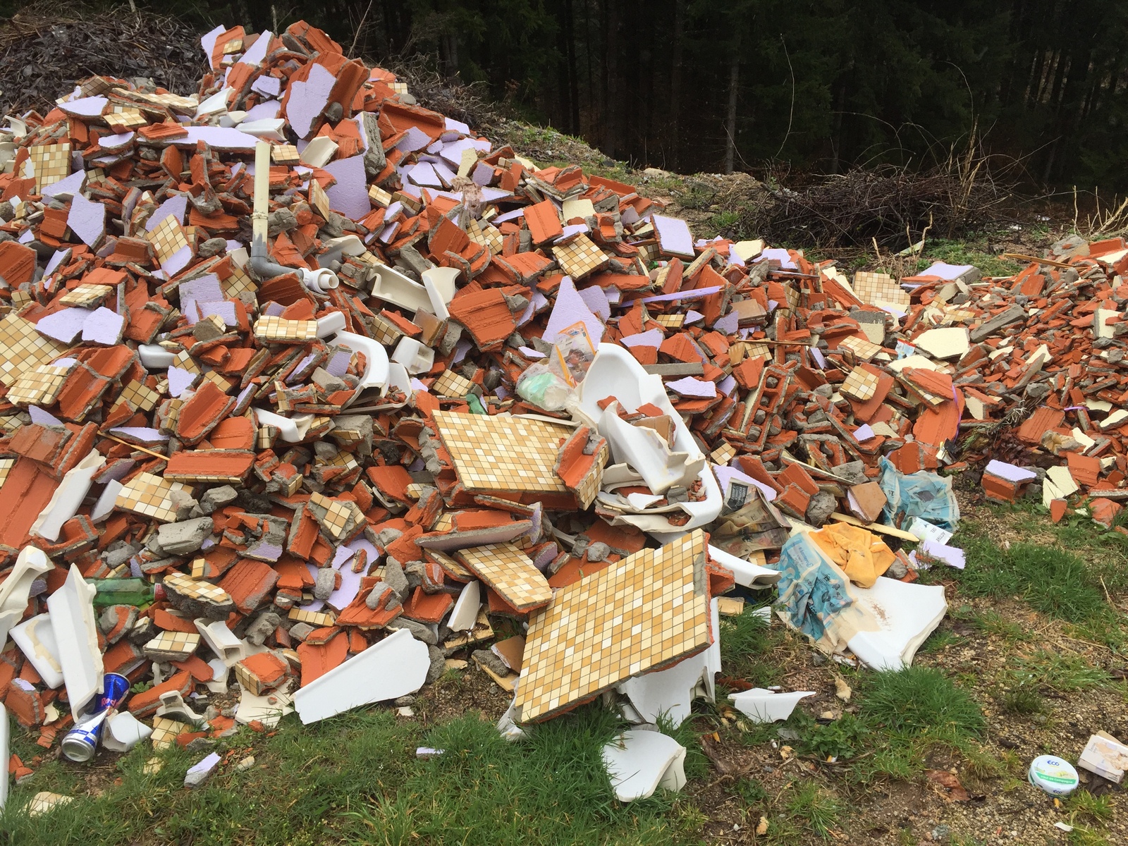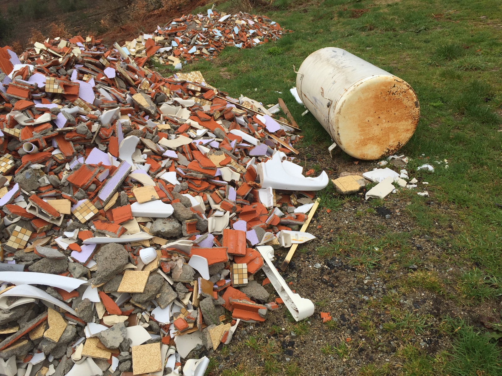 Dépôt de gravats, déchets de démolition d’une habitation (morceaux de plomberie, carrelage, plastique, etc)