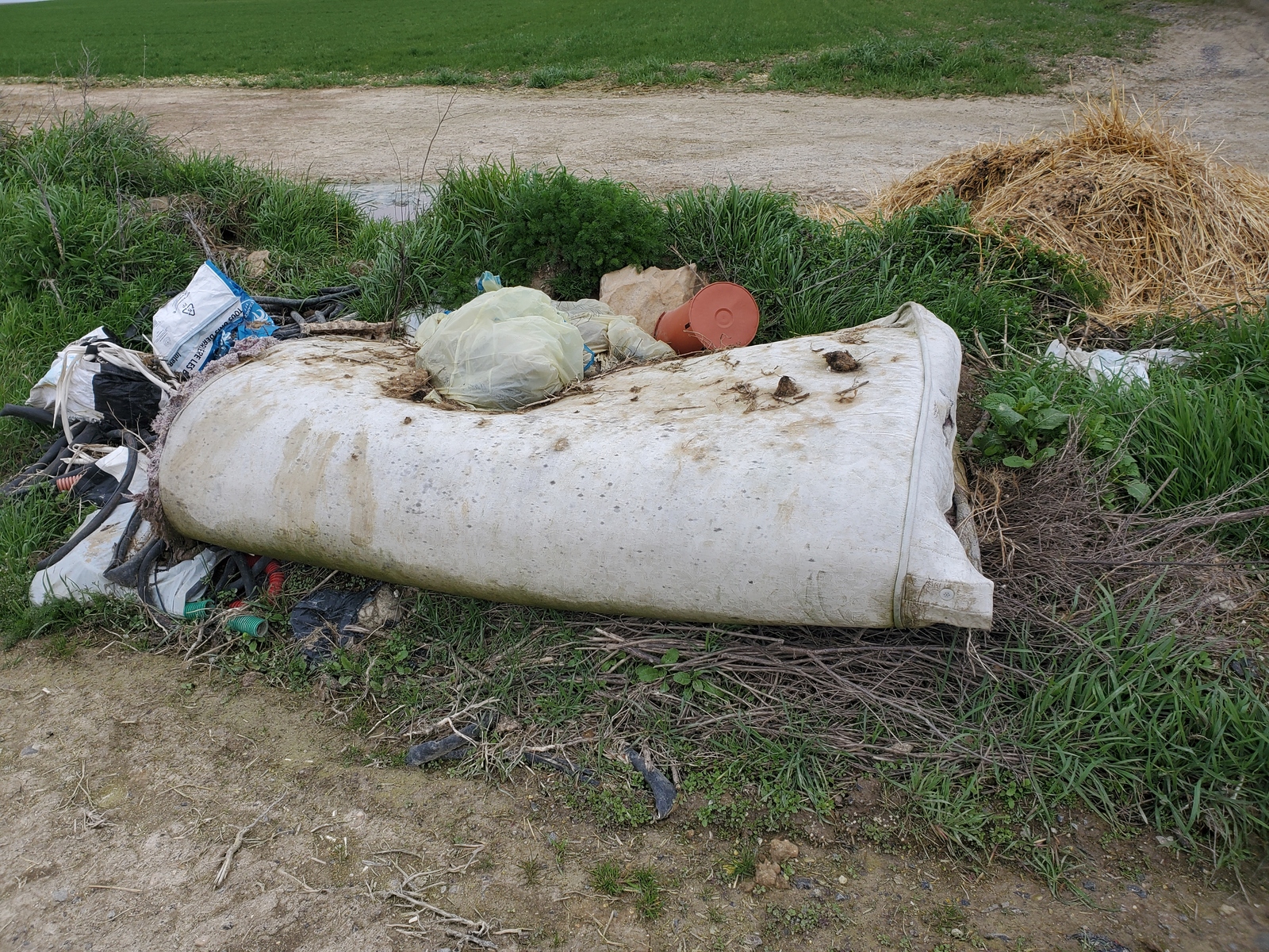Dépôt sauvage de déchets ménagers au bord d'un champs le long de la D68, entre Homblières et Fontaine-Notre-Dame. Il est notamment constitué d'un matelas, de sacs plastiques et de poubelles.