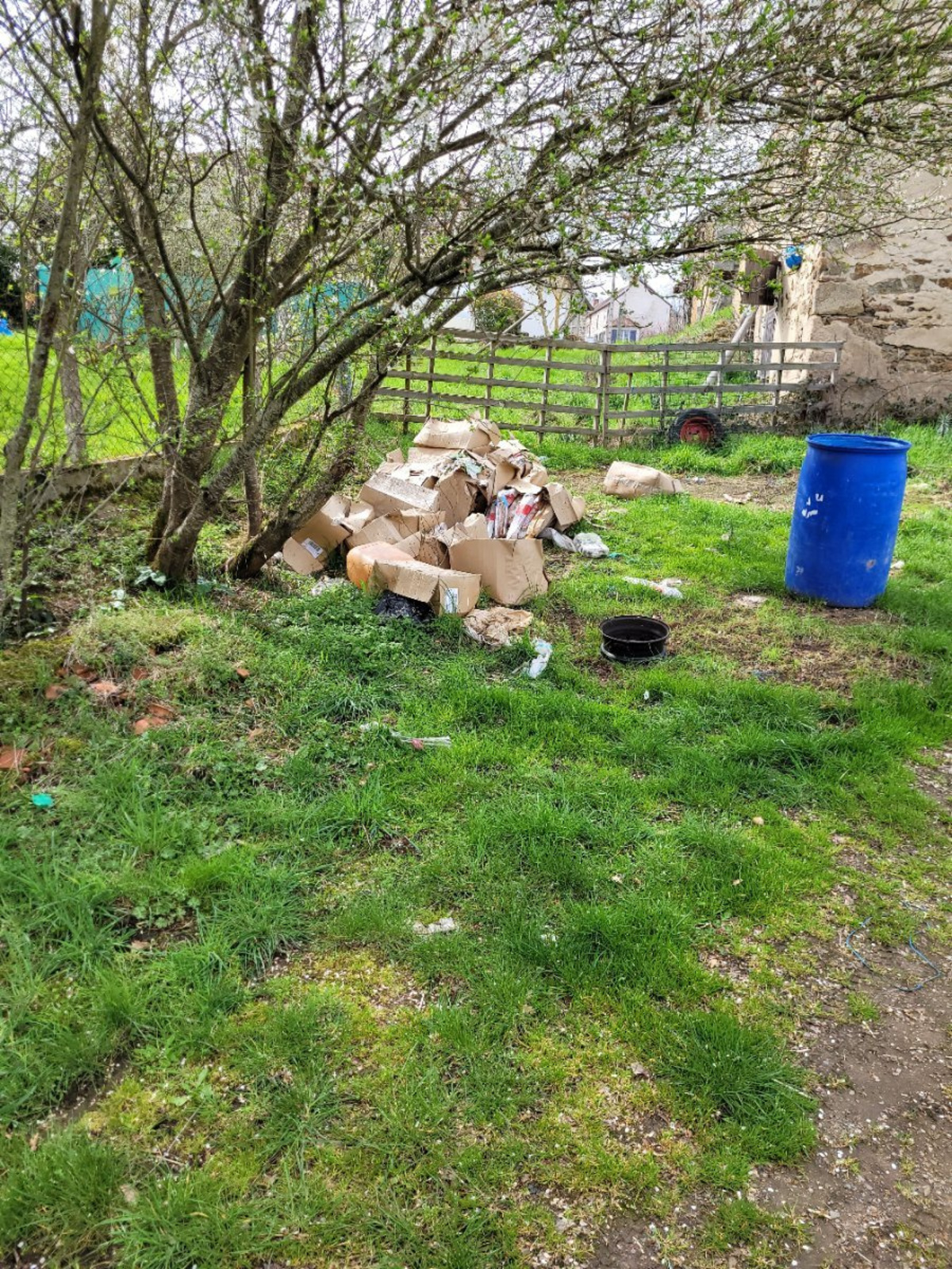 Abandon de déchets constitué de cartons, papiers, tonneau et bassine plastique.