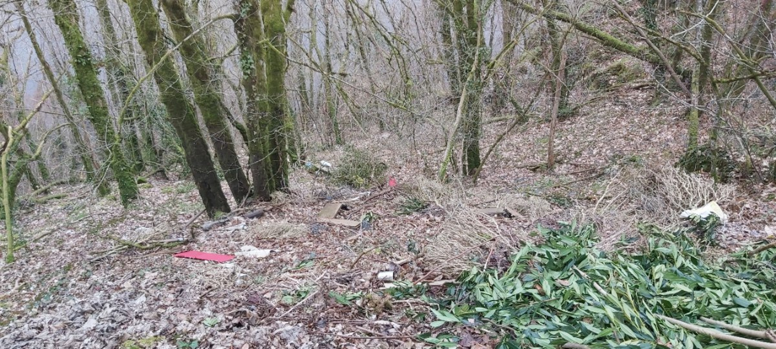 Divers déchets épars dans forêt