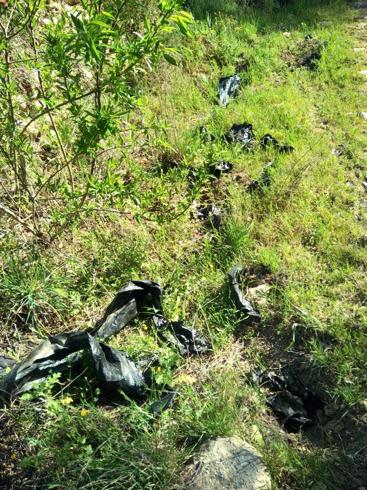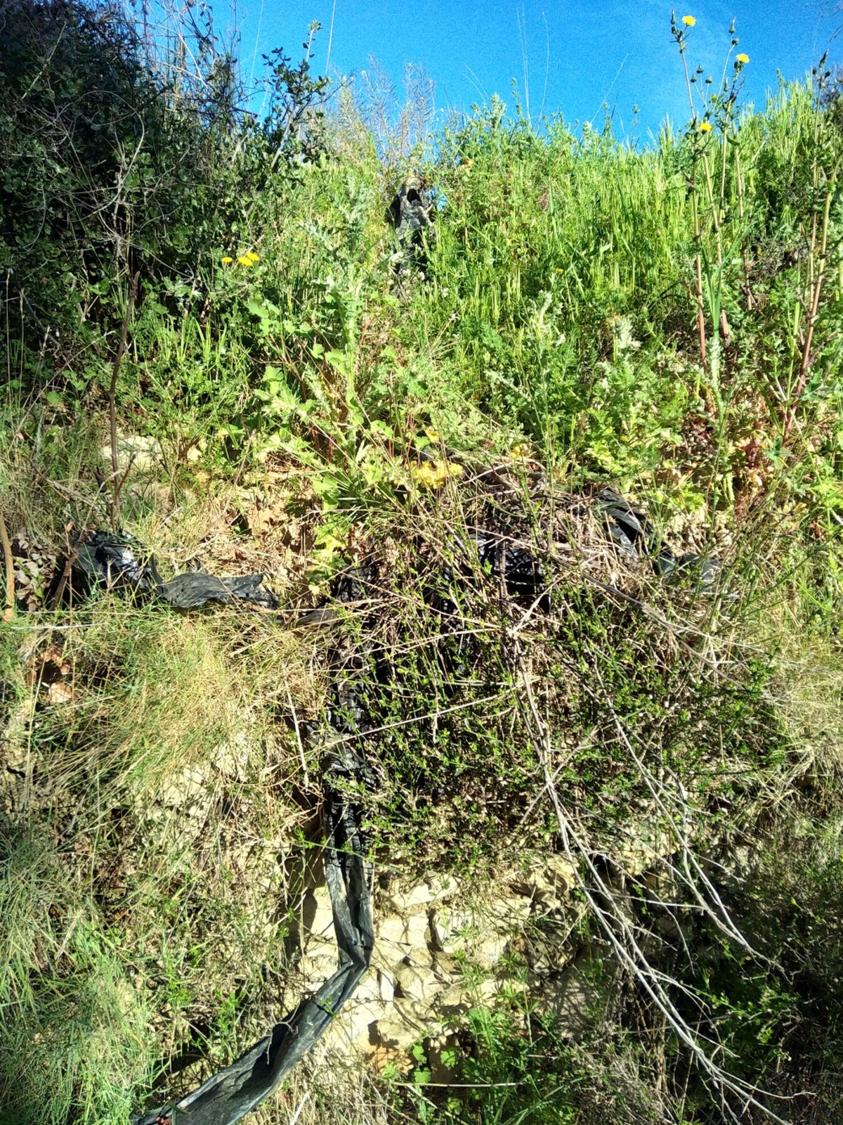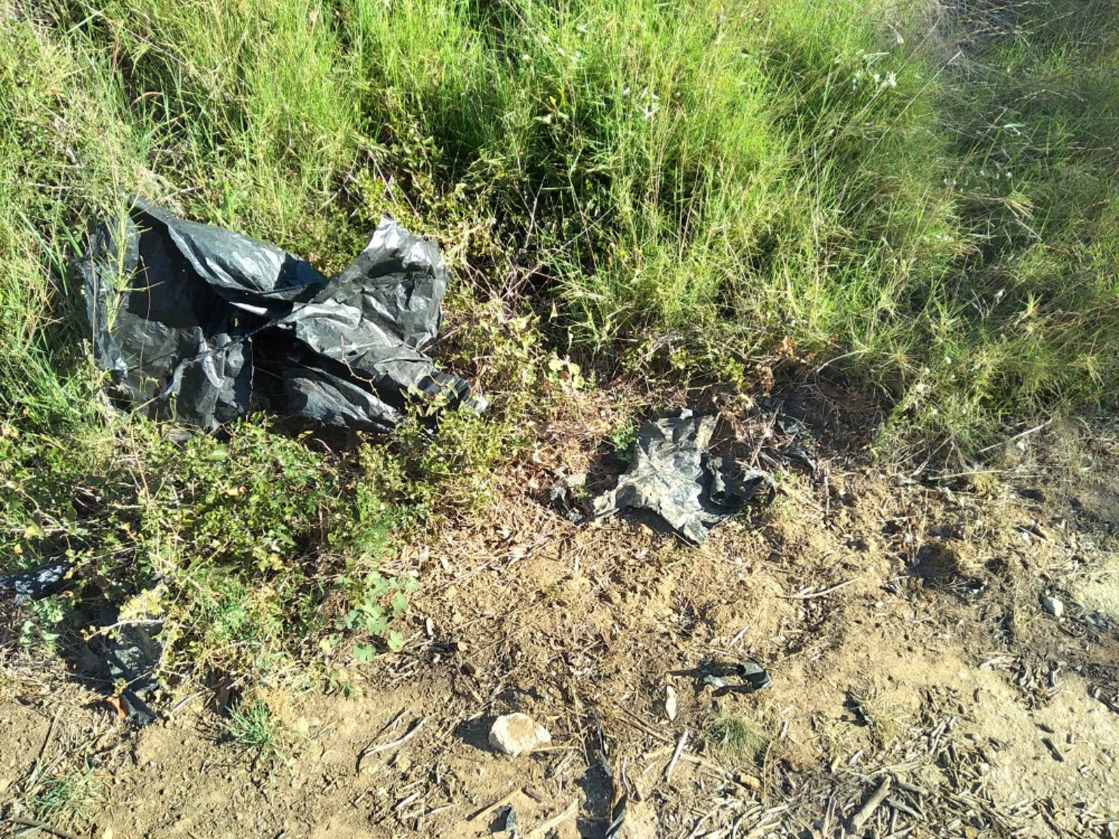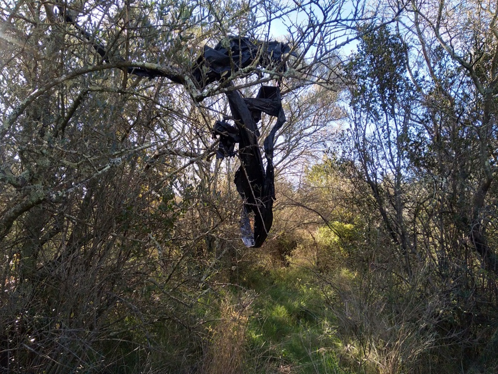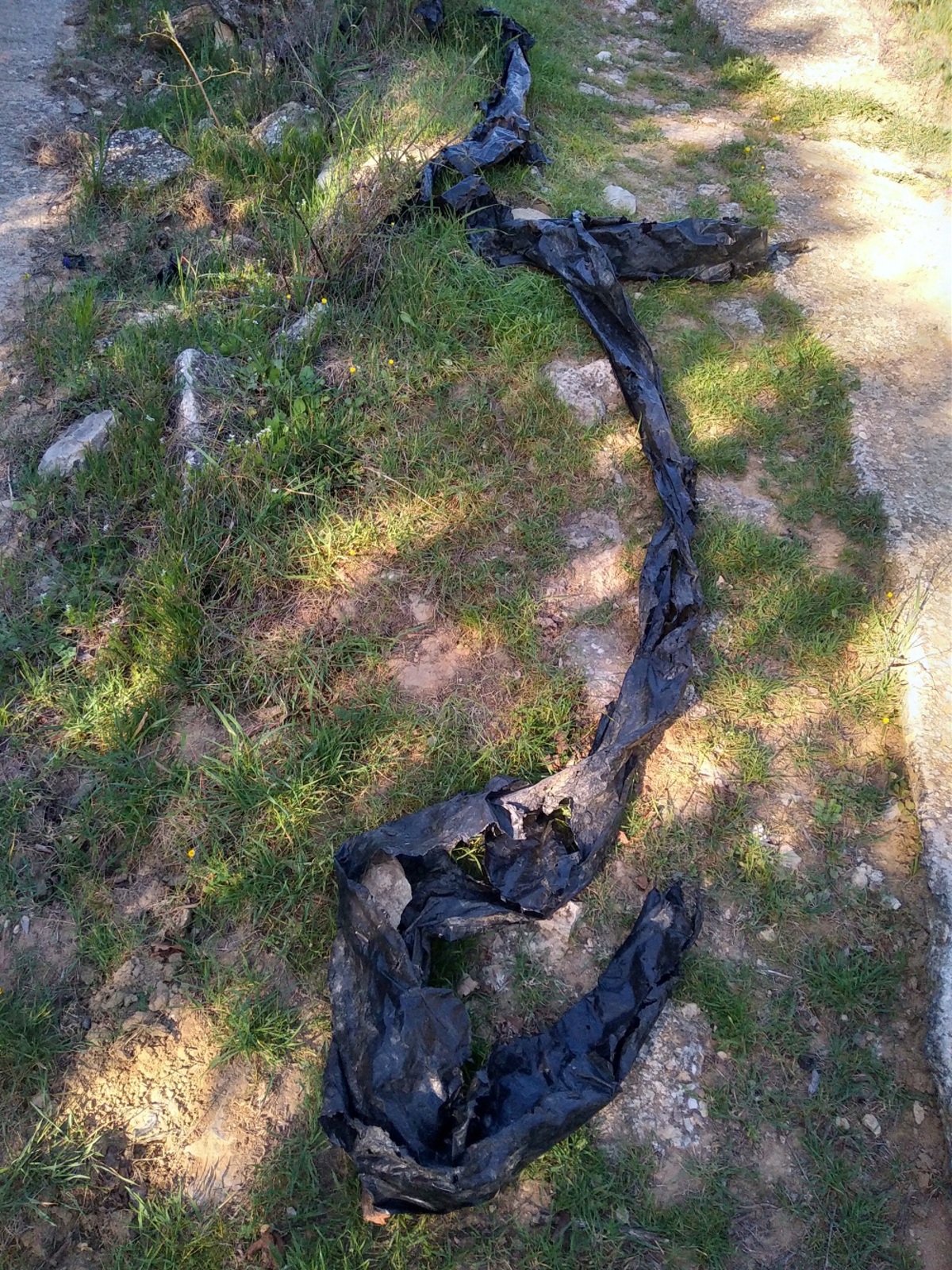 Restes de paillis plastiques qui s'éparpillent sur une vaste zone.