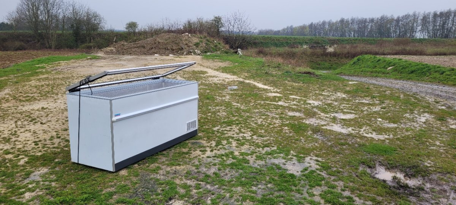 Dépôt sauvage de déchets sur une plateforme agricole dans la commune de Fayet. Ce dépôt est constitué d'un congélateur laissé à l'abandon.