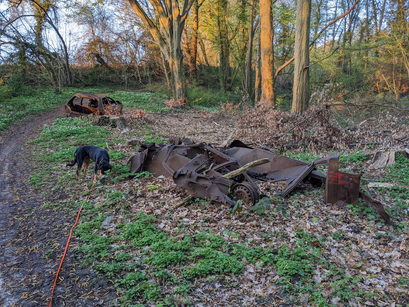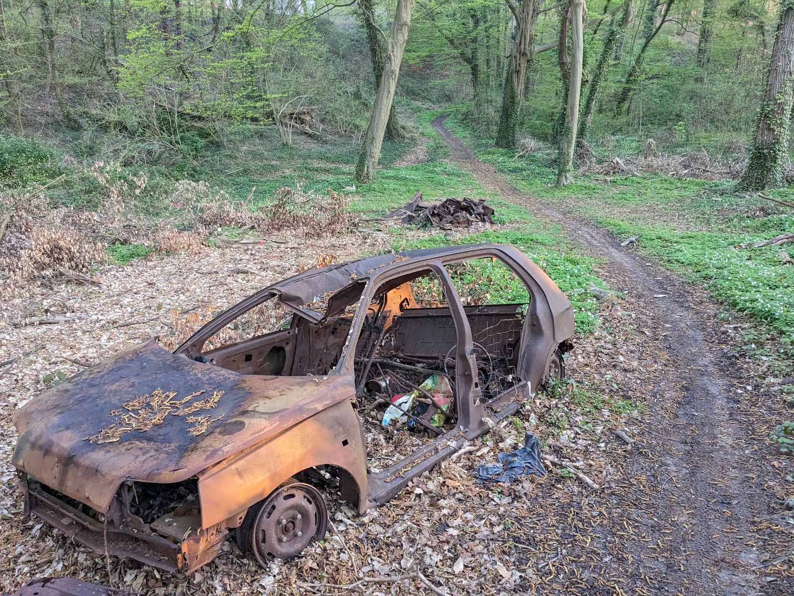La carcasse d'un véhicule hors d'usage a été laissée à l'abandon au sein de la forêt départementale du Madrillet
