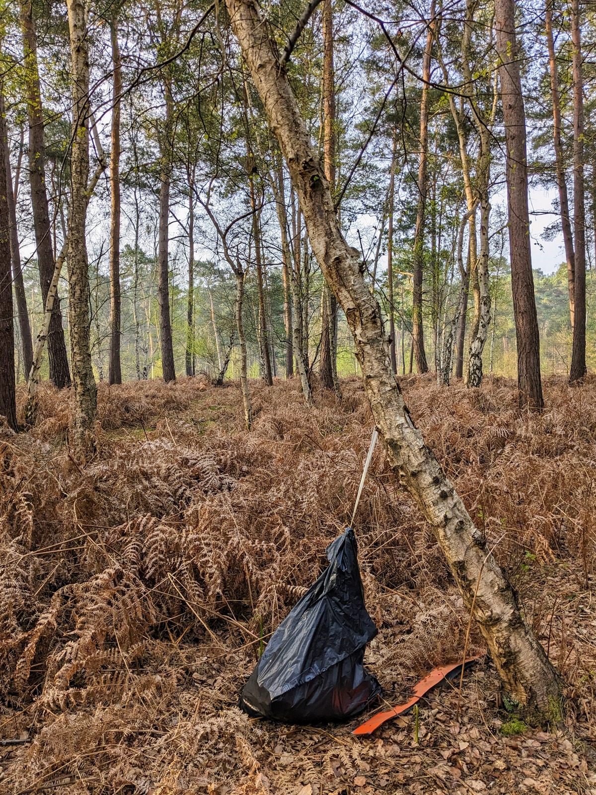 Dépôt d'un sac poubelle attaché à un arbre en forêt