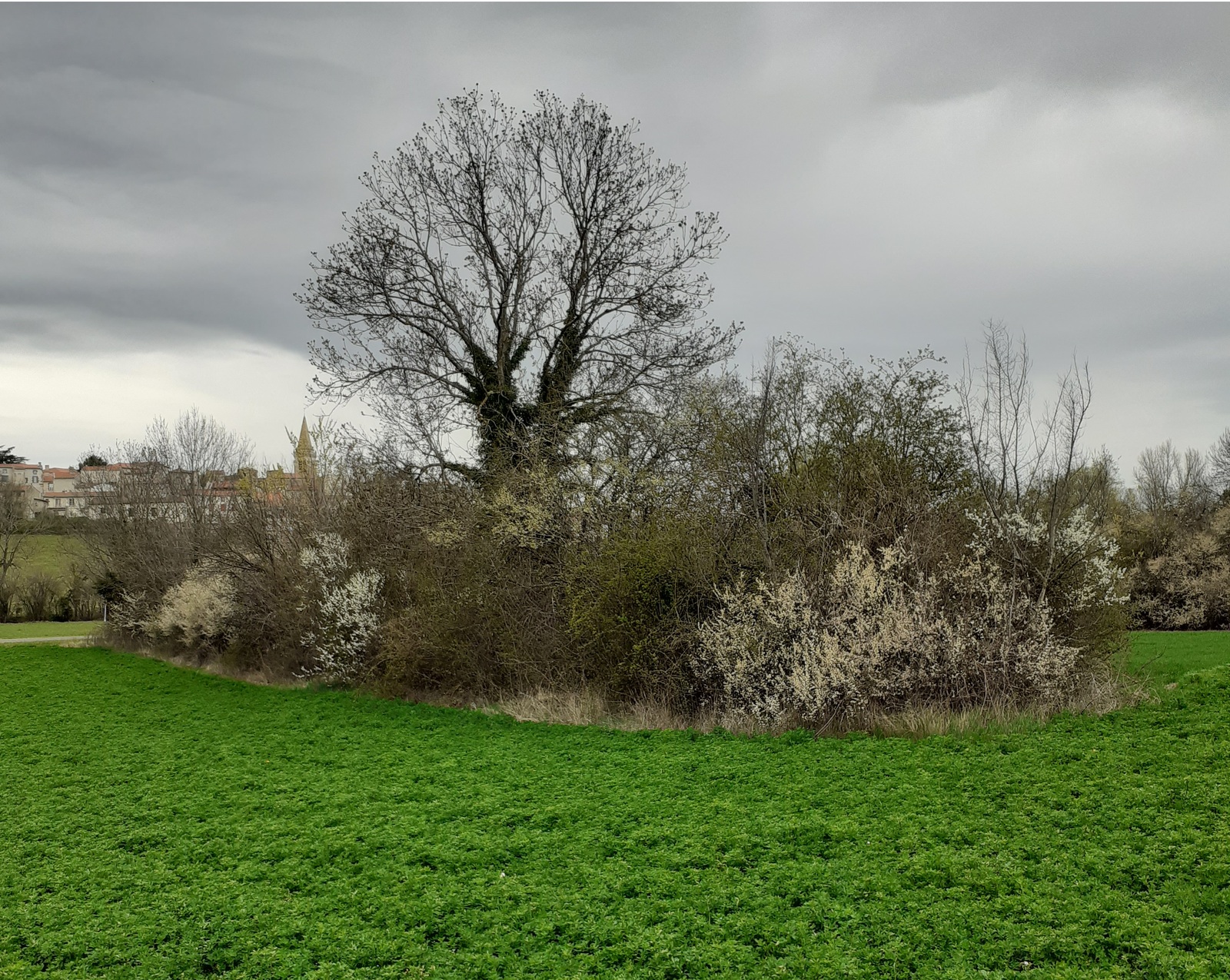 Haie de 72 mètres de long et 8 m de large ! en évolution naturelle entre espaces cultivés, présentant un étagement de strates arbustives et arborées. L'implantation Est-Ouest constitue un obstacle physique aux vents dominants. Importante biodiversité animale et végétale